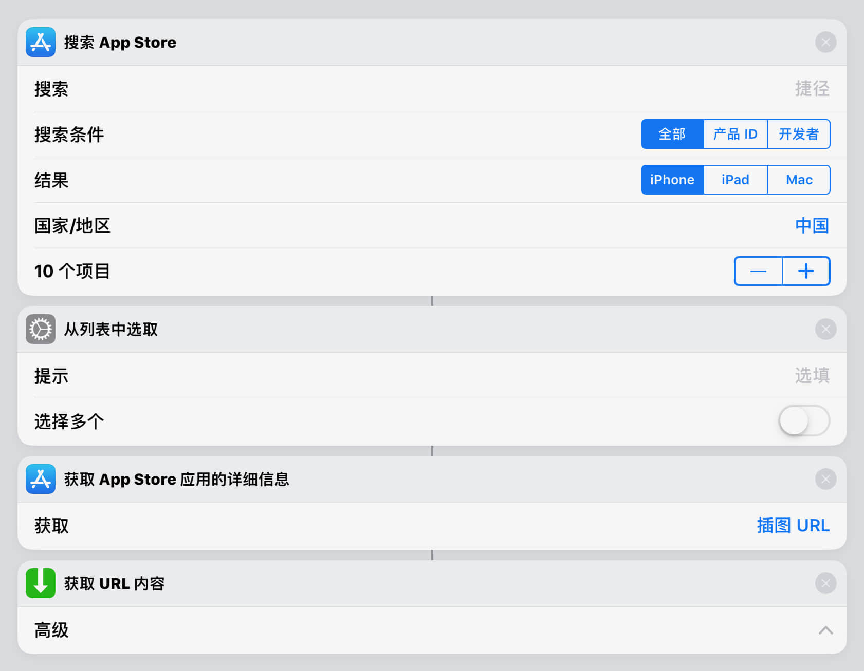 理论上,我们可以通过它来解决脱离 App Store 这个需求。只要在它下面加上「从列表选取」,再加上「获取 App Store 应用的详细信息」即可: