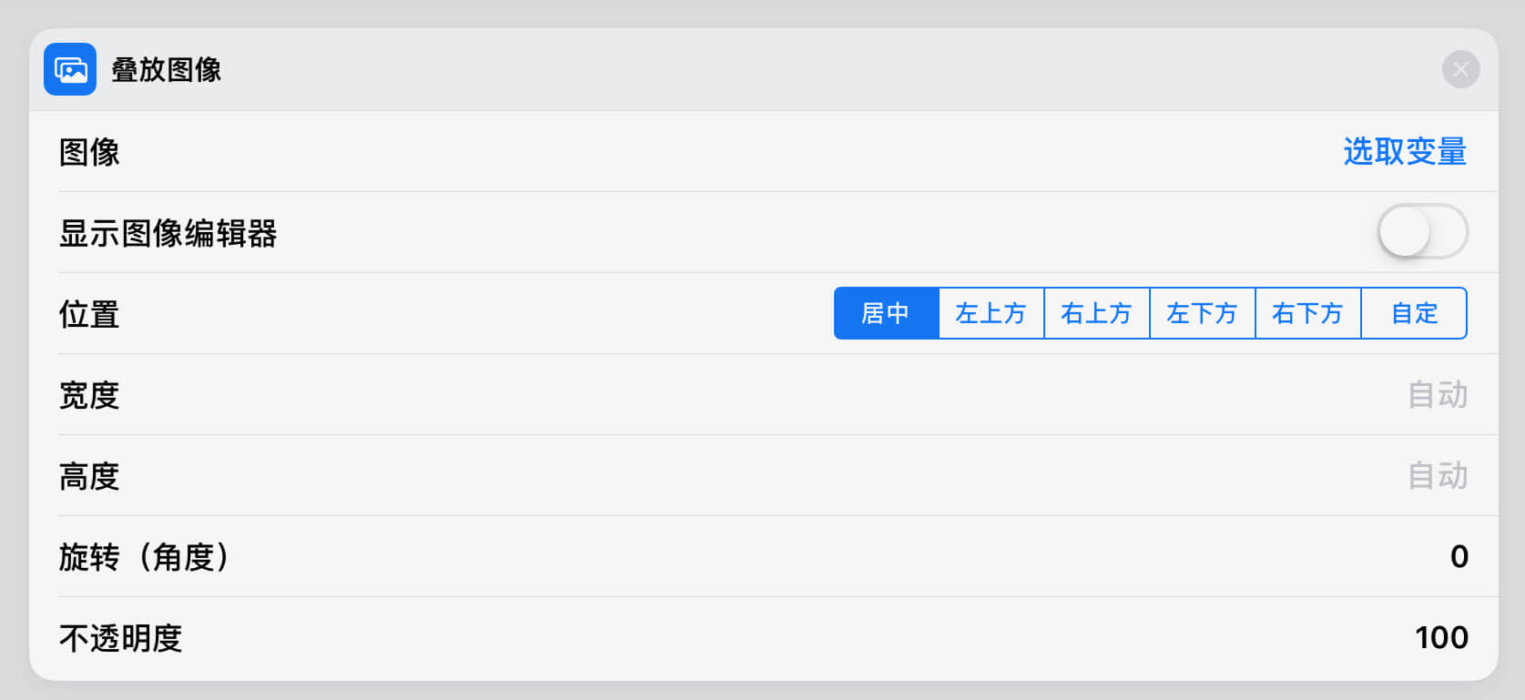 打开「显示图像编辑器」的开关后,我们可以看到下面第一行出现了「位置」这个选项,里面预设了「中央」、「左上角」、「右上角」、「左下角」、「右下角」这些基本的位置。想要进一步地自定义位置,可以在「位置」中选择「自定」,接下来你在「叠放图像」这个动作里,你就可以看到完整的自定义界面: