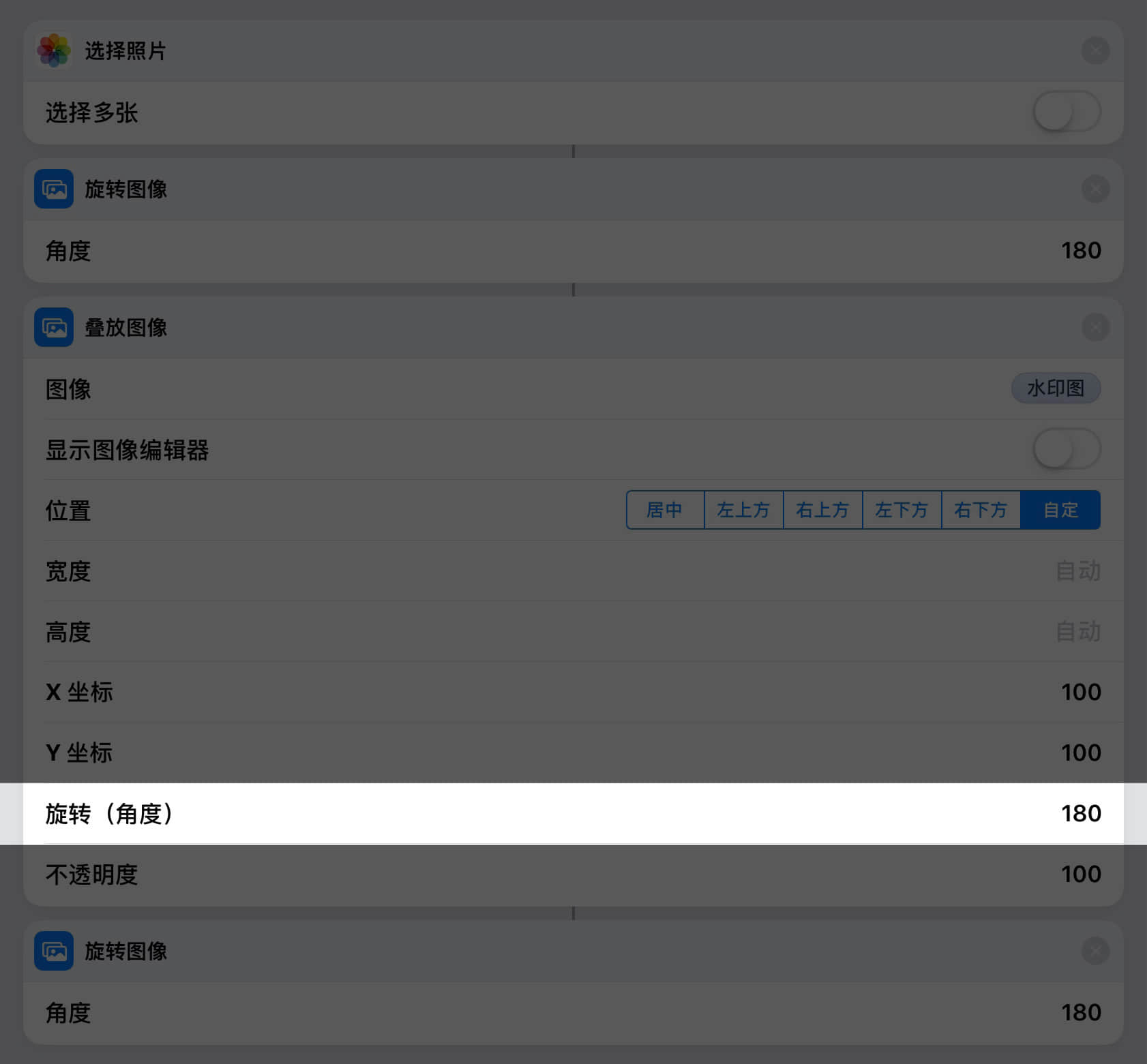 现实世界里我们把一张图放到另一张图上面时,上面那张(水印)图的位置、角度等等,我们都不会考虑太多,放上去凭感觉慢慢试就行。但转换到捷径里,我们就需要精准地描述上面这张图的坐标、大小、透明度等信息。