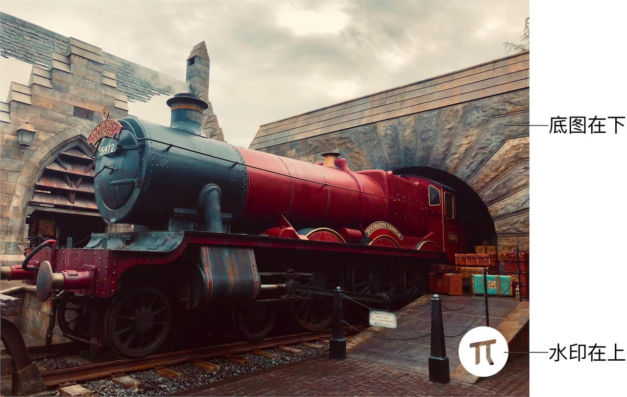 像这一张我在大阪 USJ 拍的火车头,就是水印图在上,底图(照片)在下。