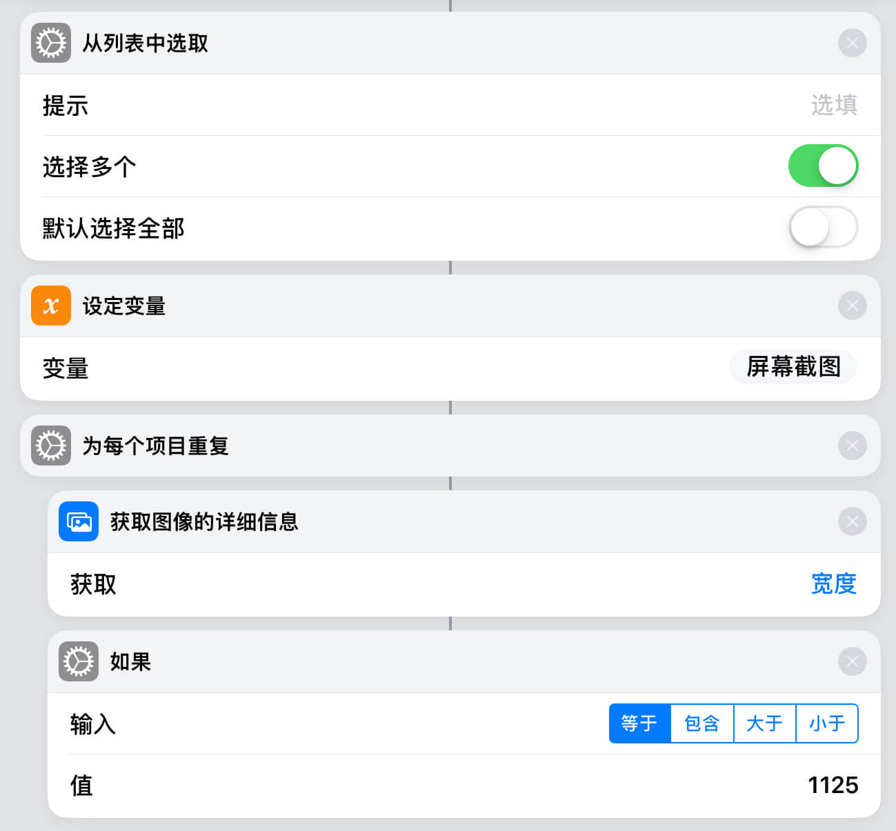 最后,不要忘了,我们的「菜单」是处于一个「如果」之中,如果带壳截图「大于」 1 时,它才会弹出菜单。如果不大于 1,那就说明带壳截图只有一张,这样我们还是直接获取带壳截图的变量,等待下一步对它的处理。