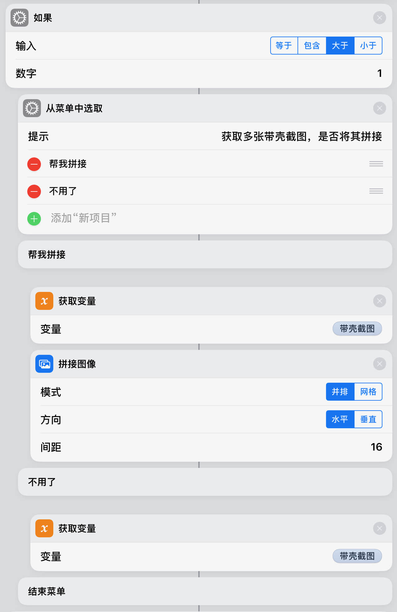 接着,我们接上「如果」,如果传进来的结果「大于」 1,那就要问,我们要不要把它们拼在一起。因为很多时候我们也未必就需要把多张带壳截图拼在一起,我们有可能只想保存多张单张的带壳截图。