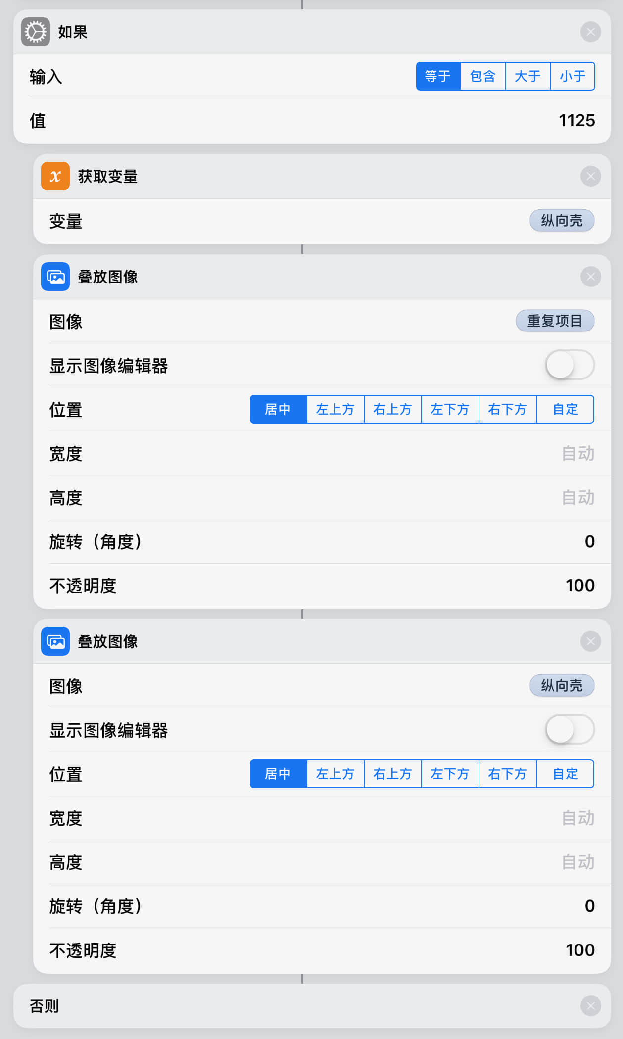 私教:套壳截图类的捷径,对素材以及对叠放图片这个操作的了解程度,要求都很高。但叠放图片逻辑比较复杂,可以说是捷径里隐含信息最多的操作之一,写清楚它的逻辑又过于枯燥。所以如果你使用了自己的素材,不能很理想地完成这个捷径,可以在群里单独咨询我。