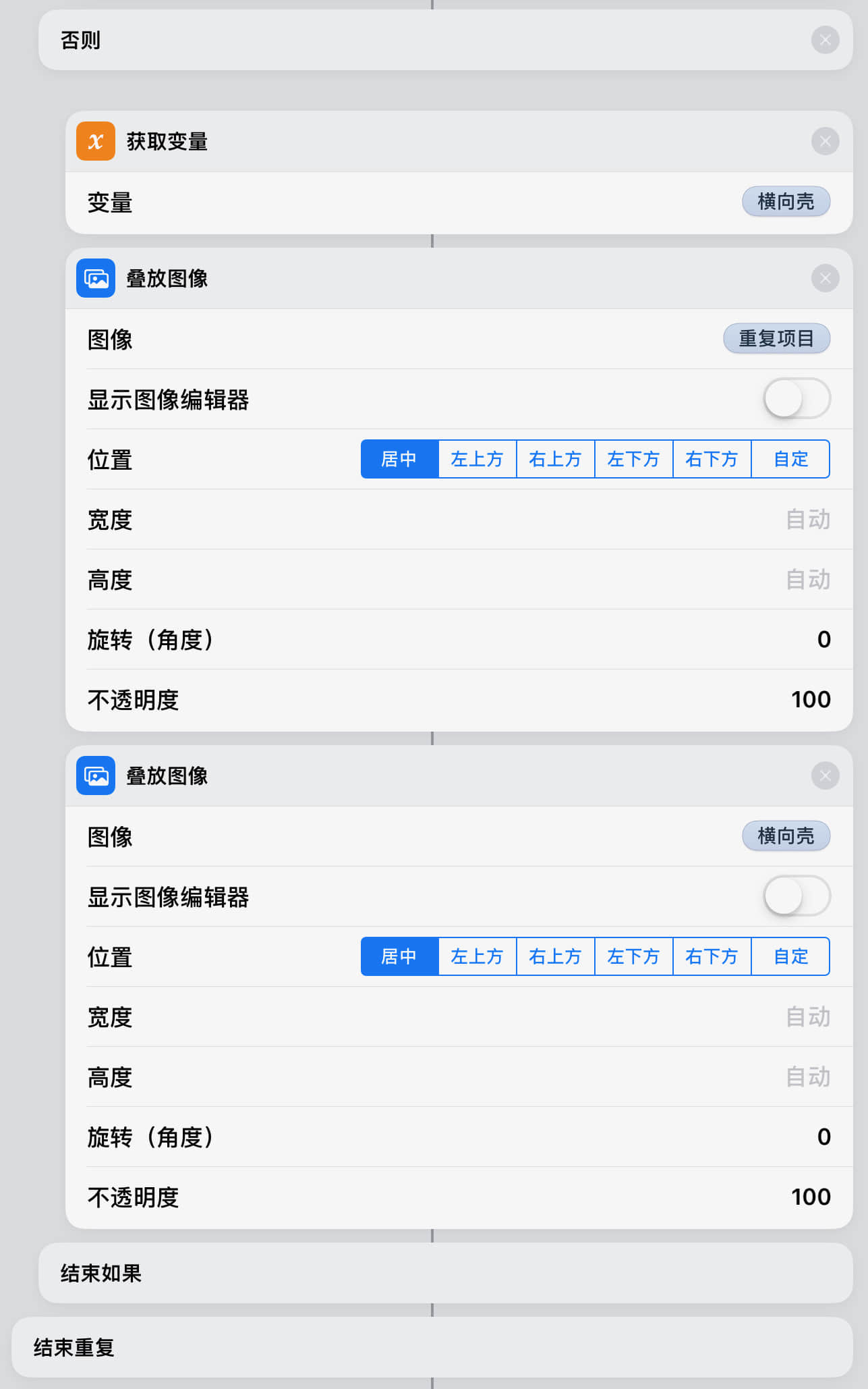 接着,「叠放图像」这一步我们放的是截图,也就是现在正在重复的项目,因为我们现在就是在为我们选择的所有截图一张一张重复地套壳。关于「重复项目」这个知识点,我们在《重复相关的操作》中也讲过。 随后,下一个「叠放图像」,我们要在「图像」中选择最初在第一步中设定好的纵向壳的变量,因为这次我们要把壳,放在截图的上方。