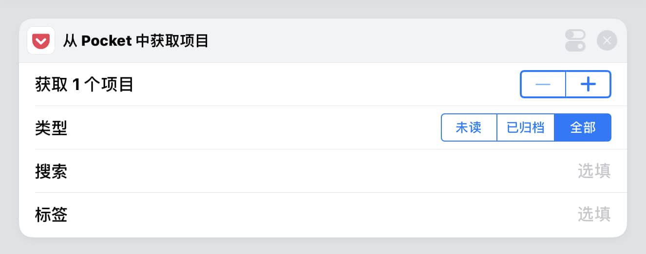 在捷径中批量导出 Pocket 的文章要靠一个操作——「从 Pocket 中获取项目」: