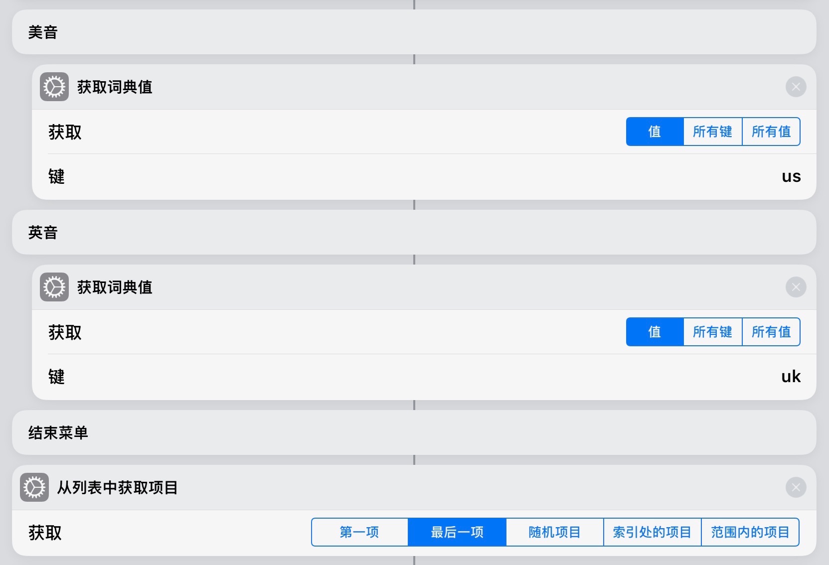 随后在下面接上菜单,菜单分别设为美音和英音。再在其中分别加上「获取词典值」:「美音」的选项下,「获取词典值」的内容就填 us;「英音」的选项下,「获取词典值」的内容就填写 uk: