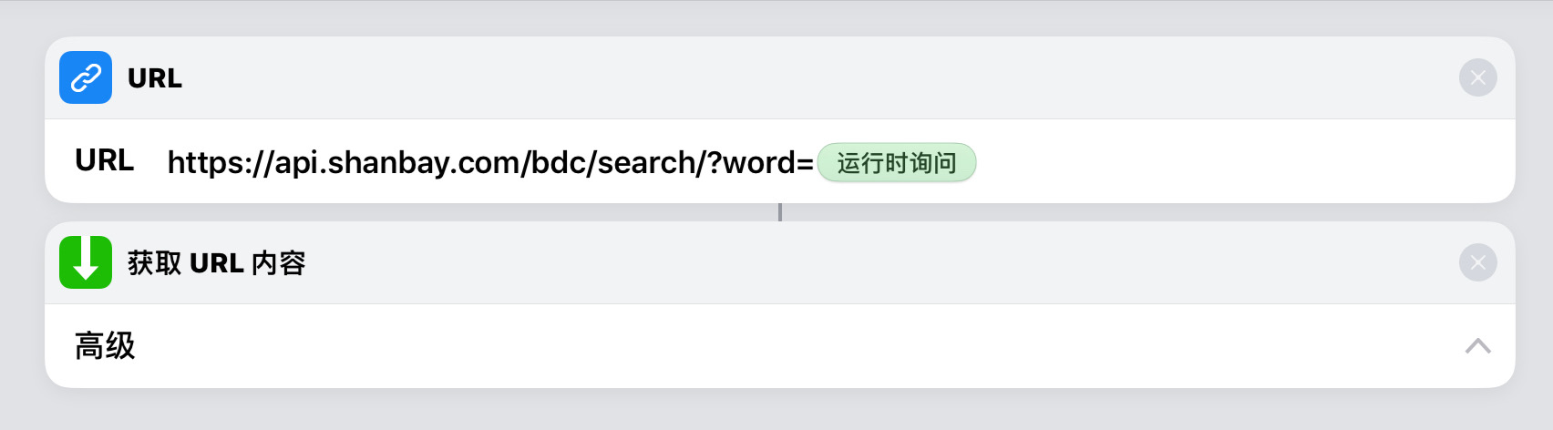 想要每次手动输入想要查的单词,可以把链接最后 {word} 这个部分改成魔法变量「运行时询问」。这时候「URL」这个操作里应该是这样的: