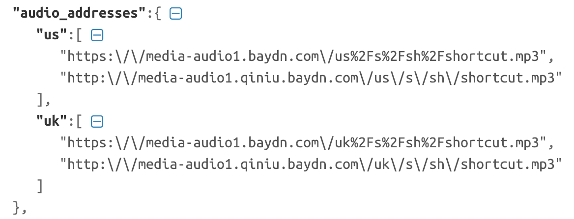 这样一来,我们就能做到临时选择发音是用英音还是用美音了。接下来,我们注意到在这个部分 JSON 对每个发音提供的都是 2 条 URL: