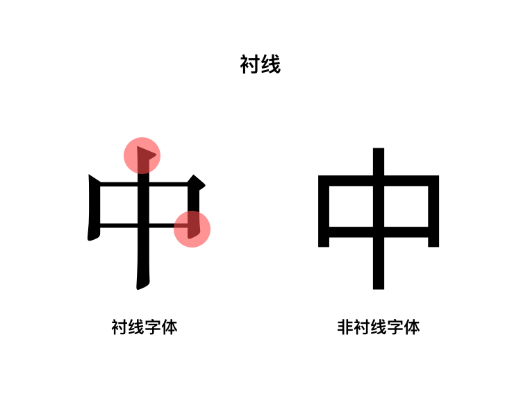 与英文字体相同,衬线字体的衬线也各式各样,对比衬线形态是区分字体的好办法。我们常见的宋体与楷体属于衬线体,而黑体则属于非衬线体。虽然楷体与宋体都可以认为是衬线体,但楷体更加偏向于模拟毛笔书写,而宋体则更加锋利平整,适合打印。