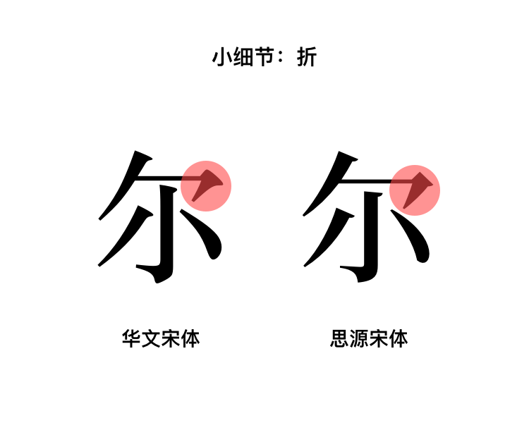 「折」笔画是分辨字体的好办法。不同字体「折」的角度、顿笔(衬线)的形状、笔画结束形态都可能有所不同。下图可以看出,华文宋体的折在结束的时候有一种笔离开纸面的感觉。思源宋体的折则更加刻意一些,感觉是用了一些力再离开纸面,比较丰满。