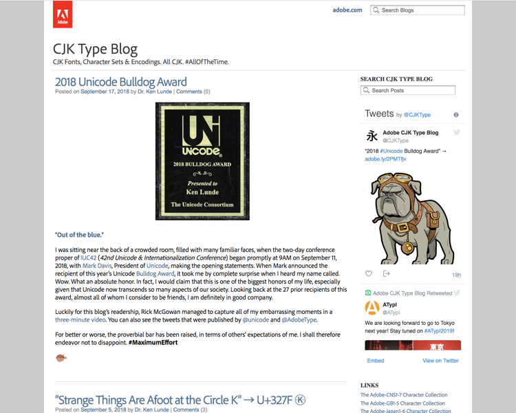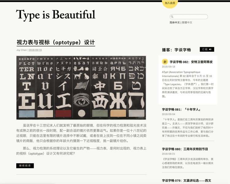 Type is Beautiful 是一个中文字体设计博客,他们的文章能够帮助你很好地了解字体设计的基础、排版原理的基础以及一些历史背景,而且不失趣味性。他们出品的《字谈字畅》播客也非常值得一听。 Adobe CJK Type Blog