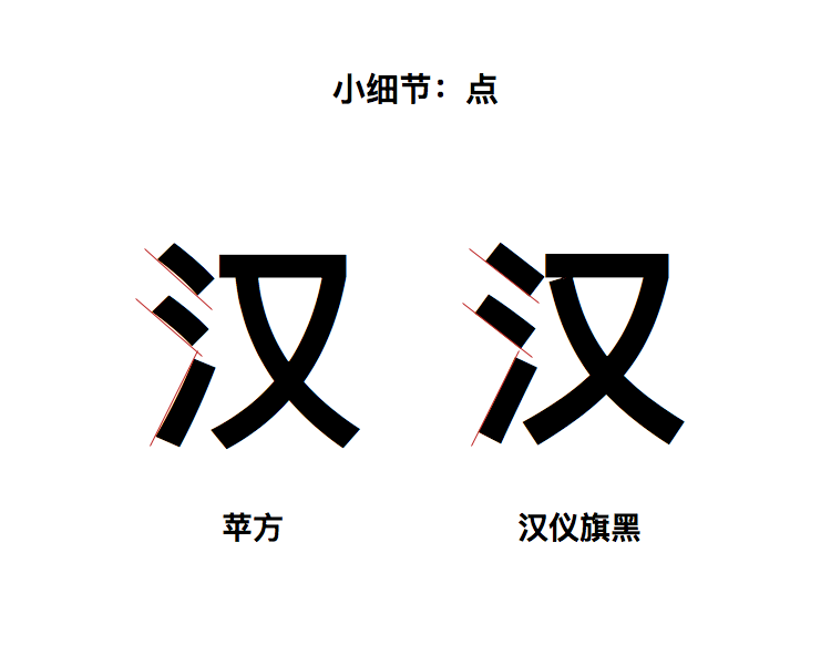 记得小学写「心」字的时候,这三个点儿一直点不对地方。「点点儿」在中文字体中可比想象中要复杂,点的弧度、长度、位置都可能让字体有这不同的气质,况且很多字不只有一个点,更是彰显字体特征的重要细节。我们可以通过对比「点」这个简单笔画分辨字体。下面这对「三点水」的例子可以看出:苹方的「点」是带有弧度的,旗黑的「点」几乎是直的。