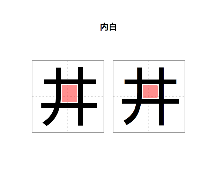 与英文字体一样,中文字体笔画之间的空间都可以称之为字怀或内白。与英文字体不同的是,中文笔画少的字天生内白较大,笔画多的字自然内白较小,而英文字母相对平均一些。