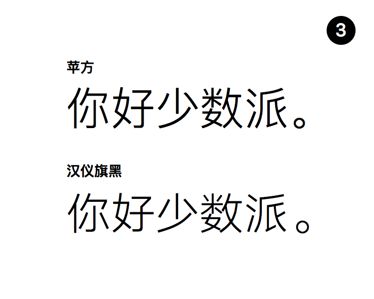 汉仪旗黑和上一题的方正兰亭黑都属于笔画近似于直线的风格。从「数」的反文旁可以看出来,旗黑的内白要比苹方大一些。此外旗黑「少」字的最后一长撇更加平行,有意给上半部分让出空间,字体整体重心相较苹方稍微低一些。