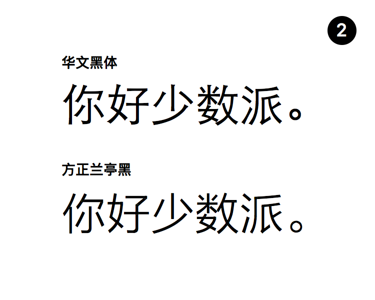 两款字体在内白的处理上差别不大,但方正兰亭黑的笔画更加偏向直线。比如「派」字右半边的第一笔撇,华文黑是明显有曲线的,而兰亭黑则向直线靠拢。
