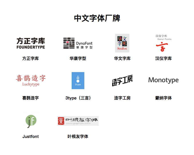 中文字体厂牌有著名的方正字库、华康字形、汉仪字库等,他们同时设计和拥有大量的正文字体和标题字体的版权,而且在命名一款字体的时候,经常会冠以厂牌名,比如「华文宋体」、「方正楷体」。国际大厂 Monotype 也设计了许多中文字体。除此之外还有类似造字工房、叶根友字体、喜鹊造字、3type 等比较专注标题字体的厂牌。来自台湾的 Justfont 则专注于制作中文网页字体。