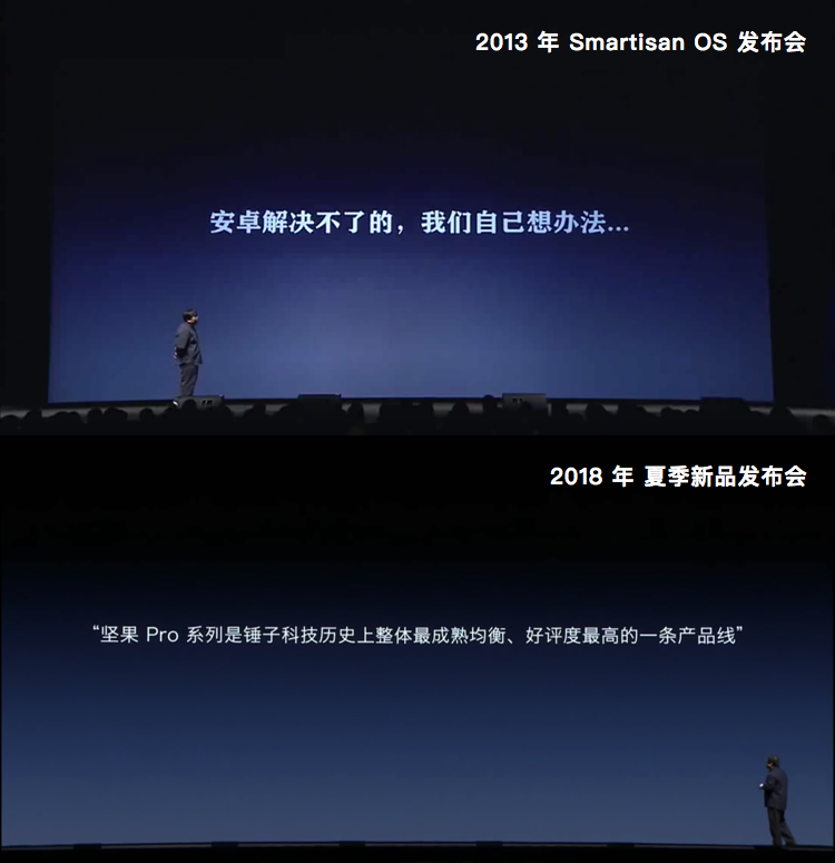 锤子科技的发布会幻灯片一度是国内科技行业发布会的标杆,当然,他们的幻灯片设计也在不停地进行演变,最大的一次变化是字体上的变化。下面是锤子科技第一场发布会和 2018 年的夏季新品发布会的字体对比图: