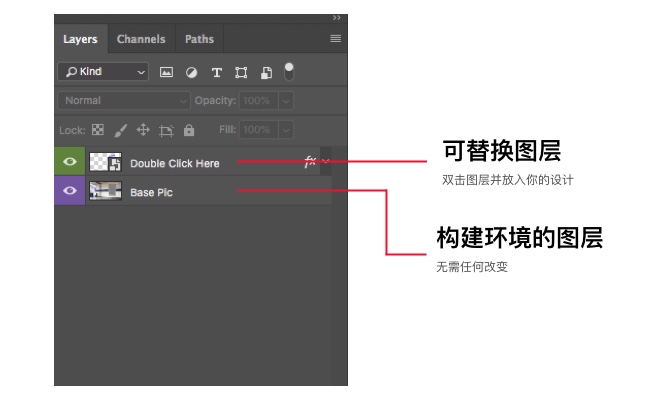 Mockup 源文件大多以 Photoshop 文档的形式存在,打开文档后通常会有一个可以替换的图层以及若干用来构建场景的图层。可替换图层通常会命名为「Click here to replace」或者「Place your design here」等,双击该图层将你的设计放入其中,最后导出为普通图片即可。