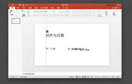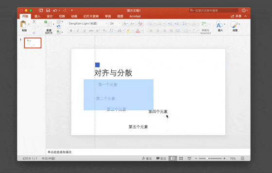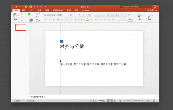 与使用对齐工具类似,先选中要分布的元素,然后选择分布方式即可。这里还有一个小技巧,如果你想让几个元素在一定高度或者宽度下进行等距分布,只需确定好第一个元素和最后一个元素,再选中全部元素进行分布即可。