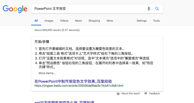 你遇到的问题通常已经有其他人遇到过,无论是谷歌百度还是必应,你都可以尝试先搜索一下自己想要的问题。比如当你使用 PowerPoint 时,想给文字加一个从白色到灰色的渐变色,你便可以先去搜索引擎中搜索「PowerPoint 文字渐变」。
