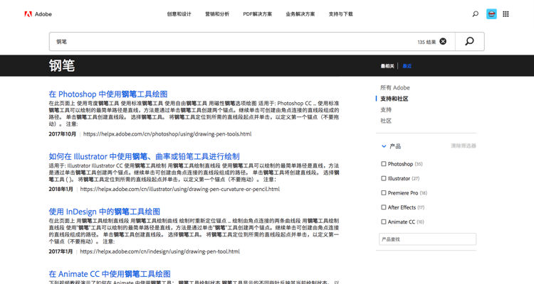 Adobe 帮助中心 是 Adobe 旗下的产品,如 Photoshop,illustrator,InDesign 的官方说明书。而且该帮助中心已经建立得非常细致,图文并茂而且完全汉化。当你不会使用 Photoshop 中的特定功能时,来 Adobe 帮助中心阅读一下官方说明书,可以了解很多东西。比如当你不知道如何使用钢笔工具时,可以直接在帮助中心搜索「钢笔」,得到的结果如下图: 同样的逻辑,当你使用其他软件时,官方提供的帮助文档也是值得一读的。