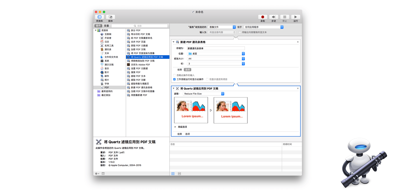 (在对话框「此操作将更改那些传给它的 PDF 文件。您想添加一个“拷贝访达项目”操作以便更改副本而保留原始文件吗?」出现时,选择「不添加」)。