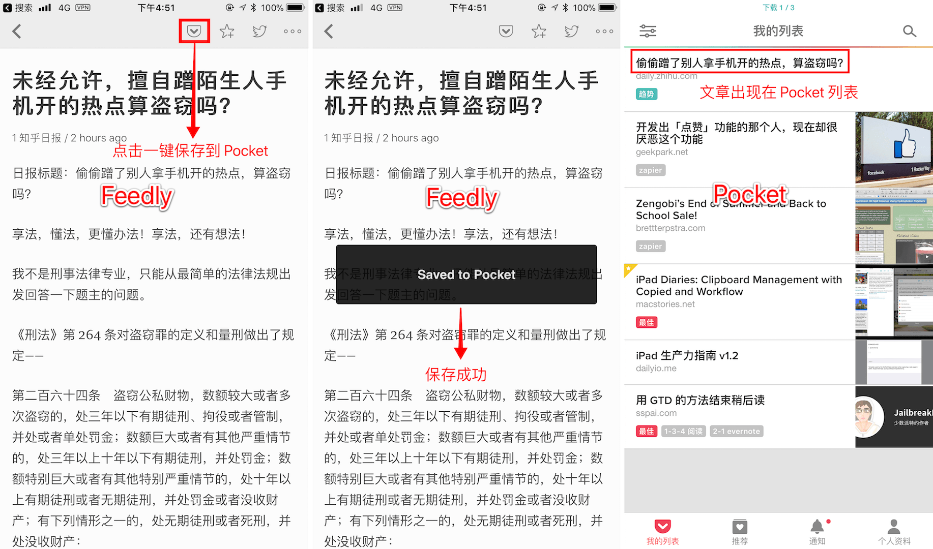 我每天都要在 Feedly 上阅读文章,大部分的文章我都会一扫而过,但是遇到那些需要我深度阅读的文章,我希望能够很方便地将这篇文章保存到 Pocket 中稍后读。 在没有实现自动化的时候,需要以下三步: