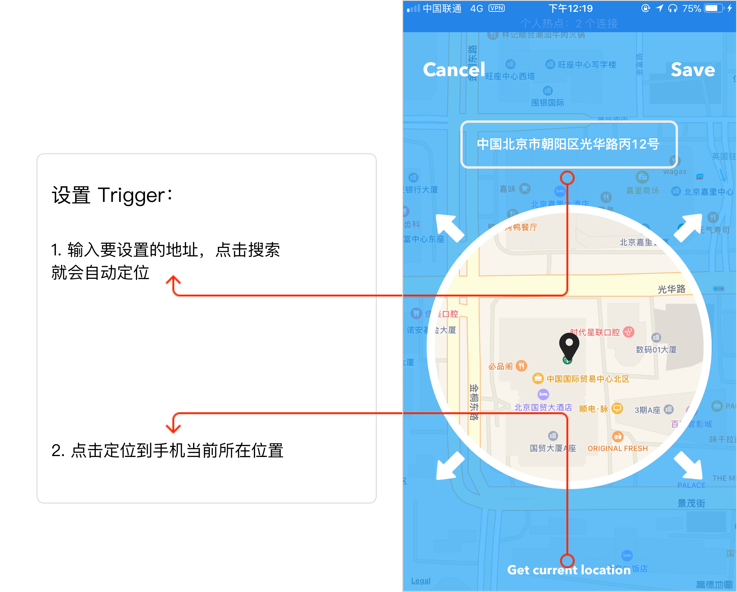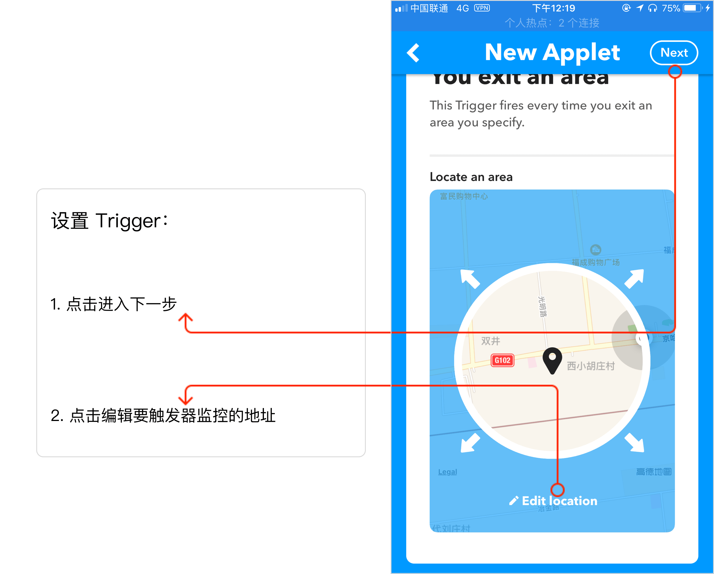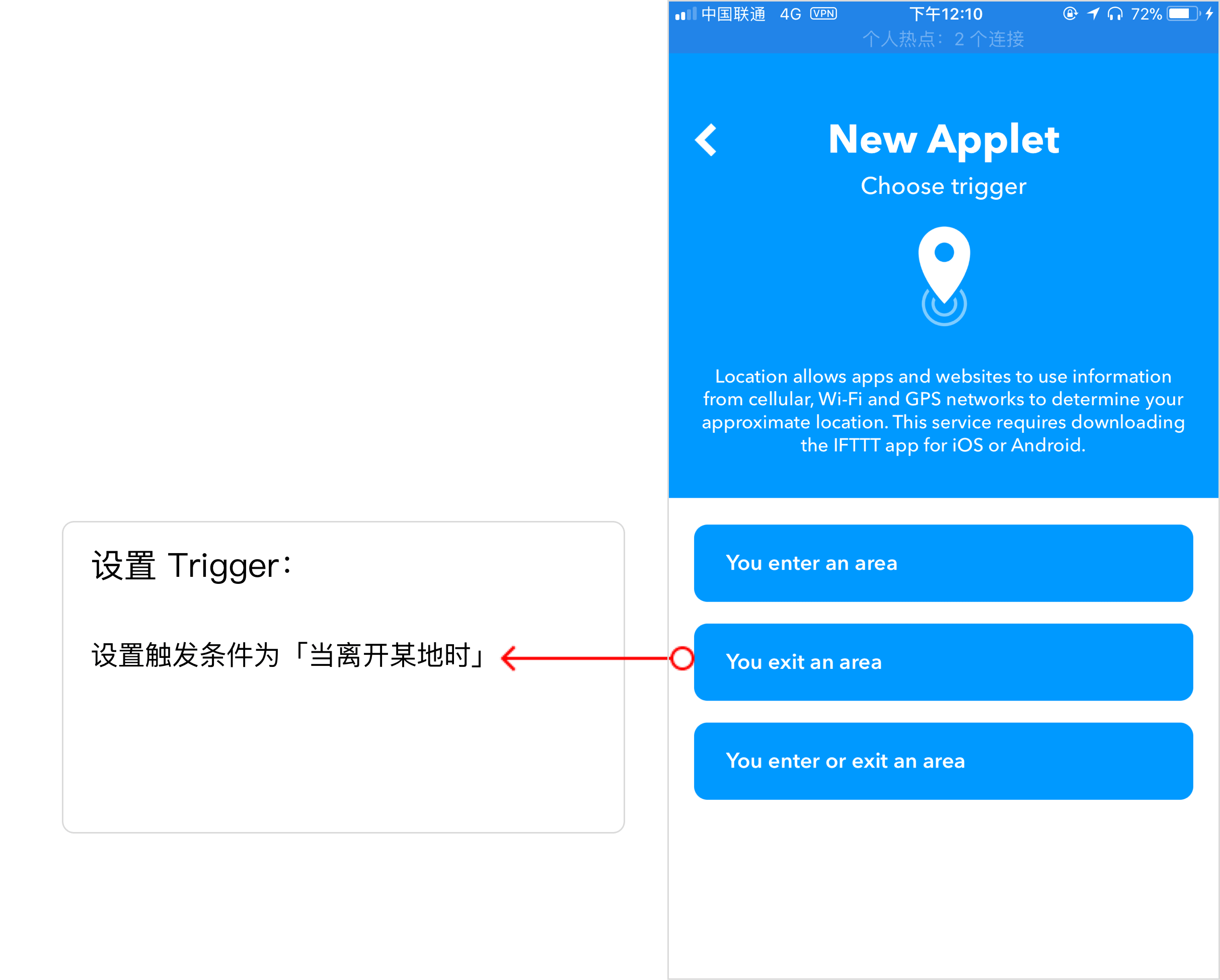选择 Trigger 对应的服务,这里选择官方提供的 Location 服务,通过搜索可以找到,并设置触发条件为「当离开某地时」。
