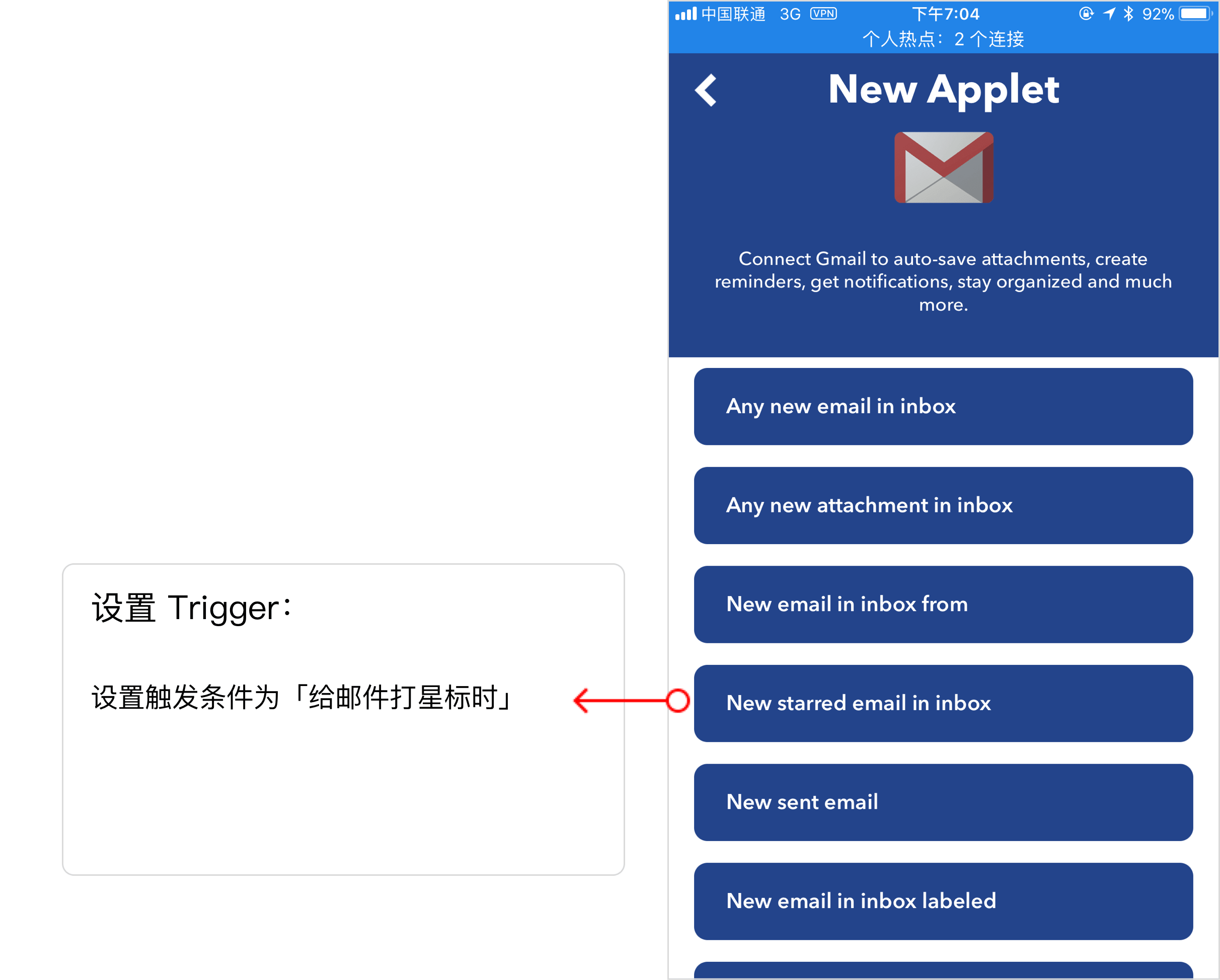 选择 Trigger 的服务,这里选择 Gmail。设置触发条件为「给邮件打星标时」。