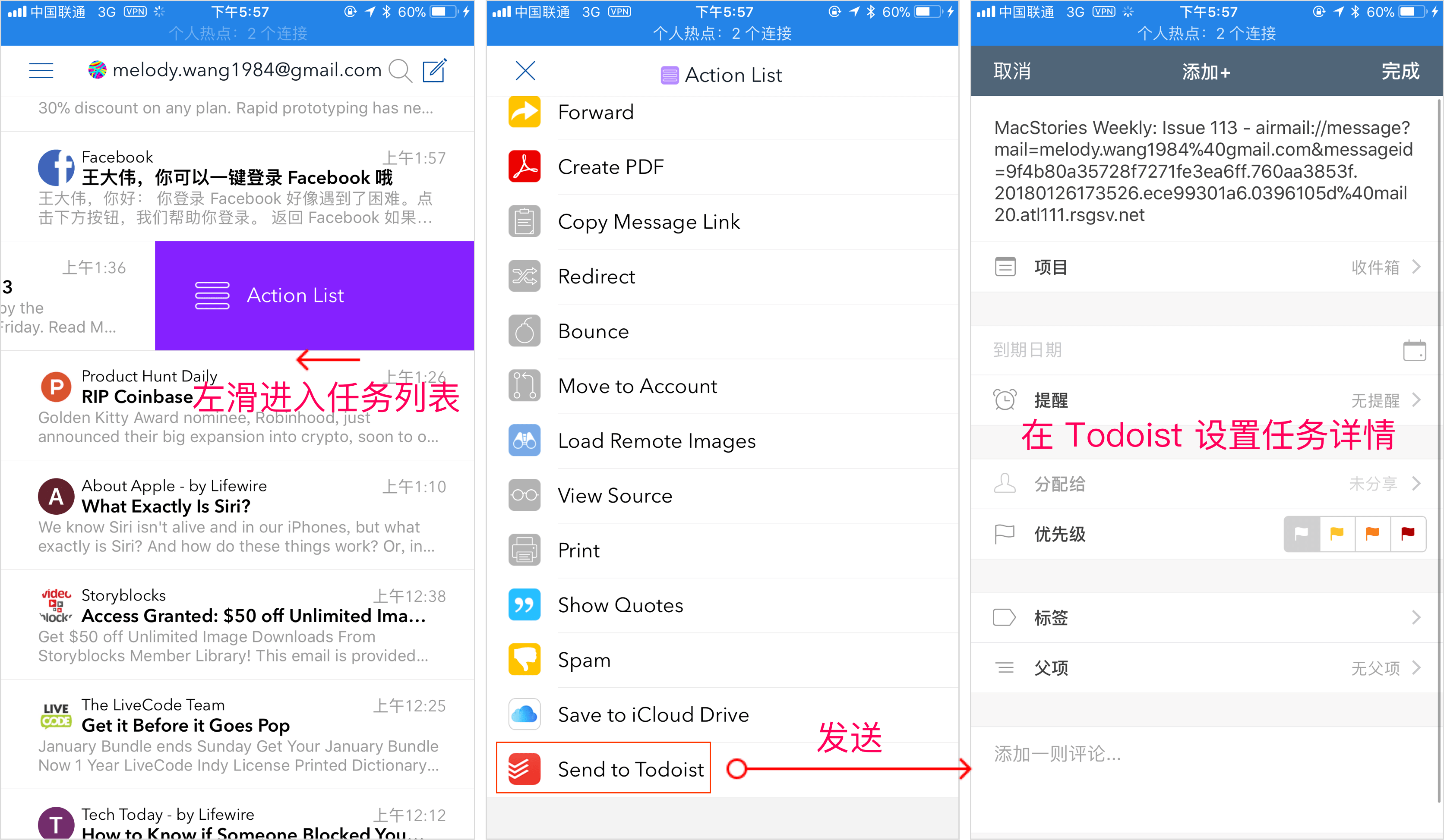 通常我喜欢在一个软件里统一管理我的「待办事项」,就只能将各种场景的待办事项发送到 Todoist。虽然 Airmail 提供了 Todoist 插件,但是使用场景略微复杂,无法像 IFTTT 一样「一键发送」,大家看下边俩图对比一下。