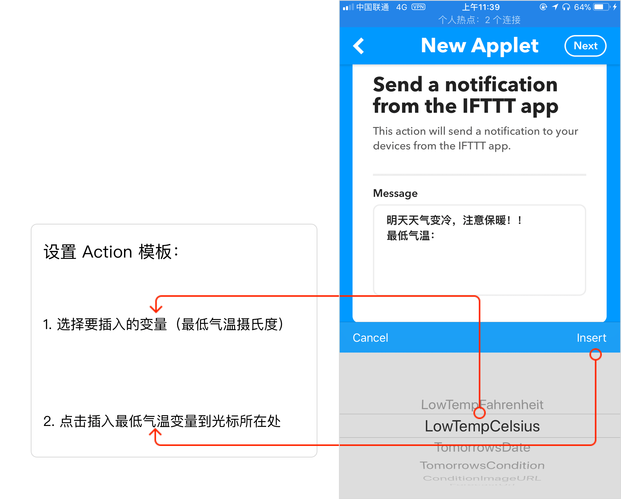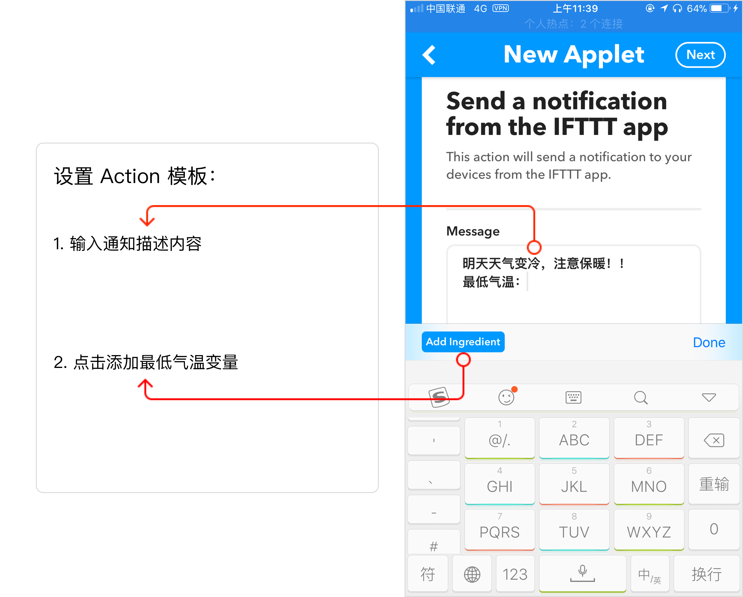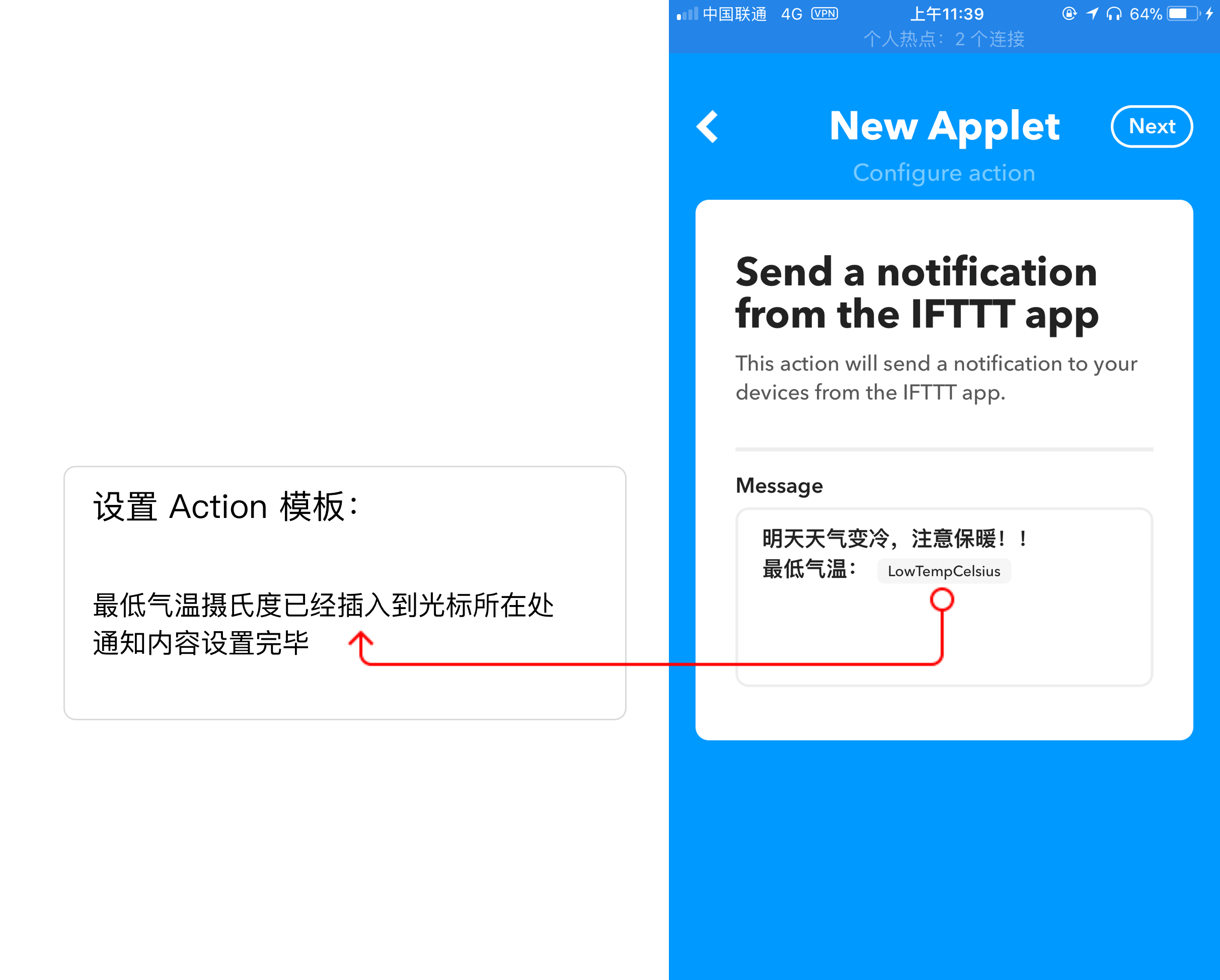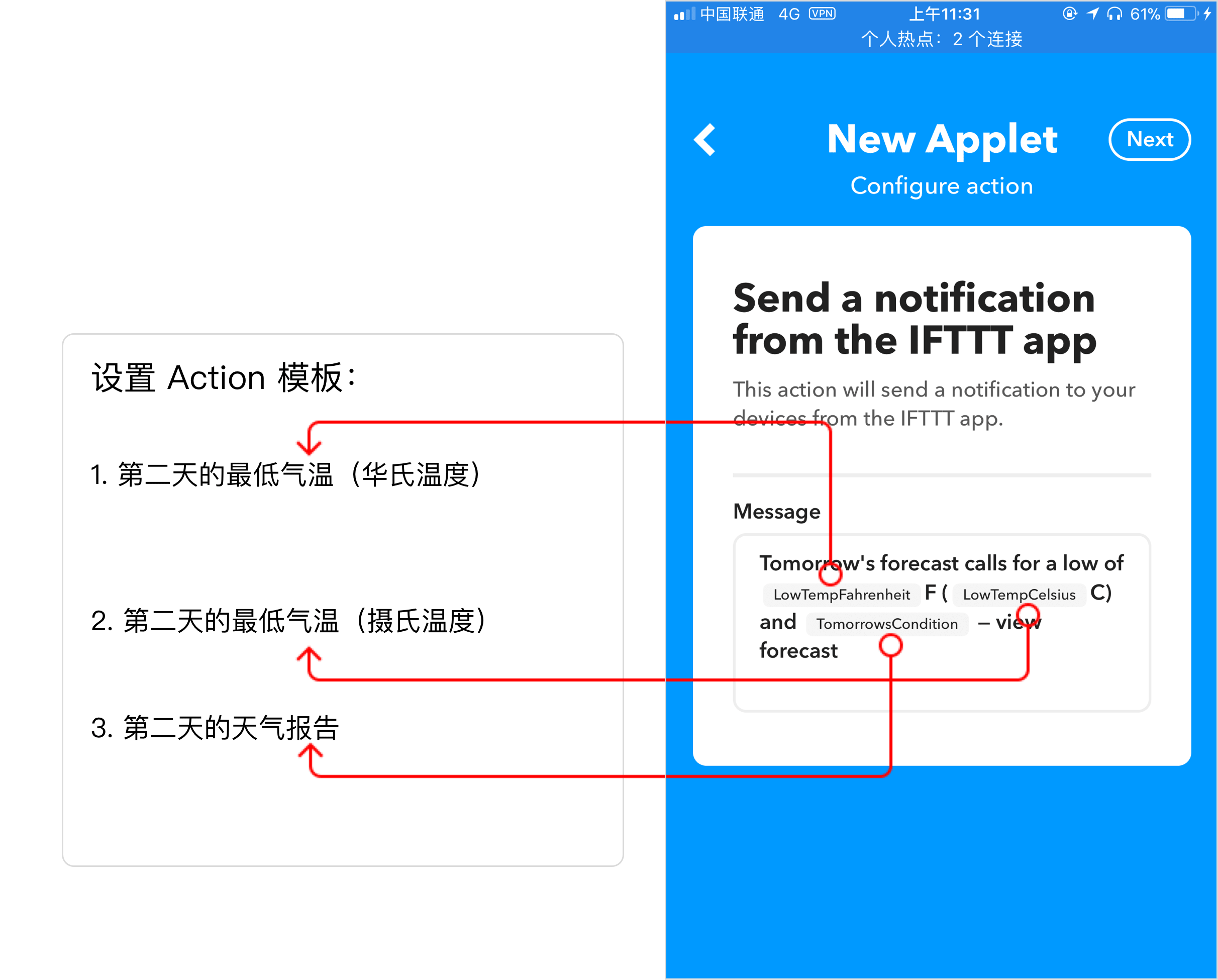 设置 Action 模版,提醒注意保暖以及第二天的最低温度。可以看到 IFTTT 自动添加了通知消息的模版,它是否符合要求呢?