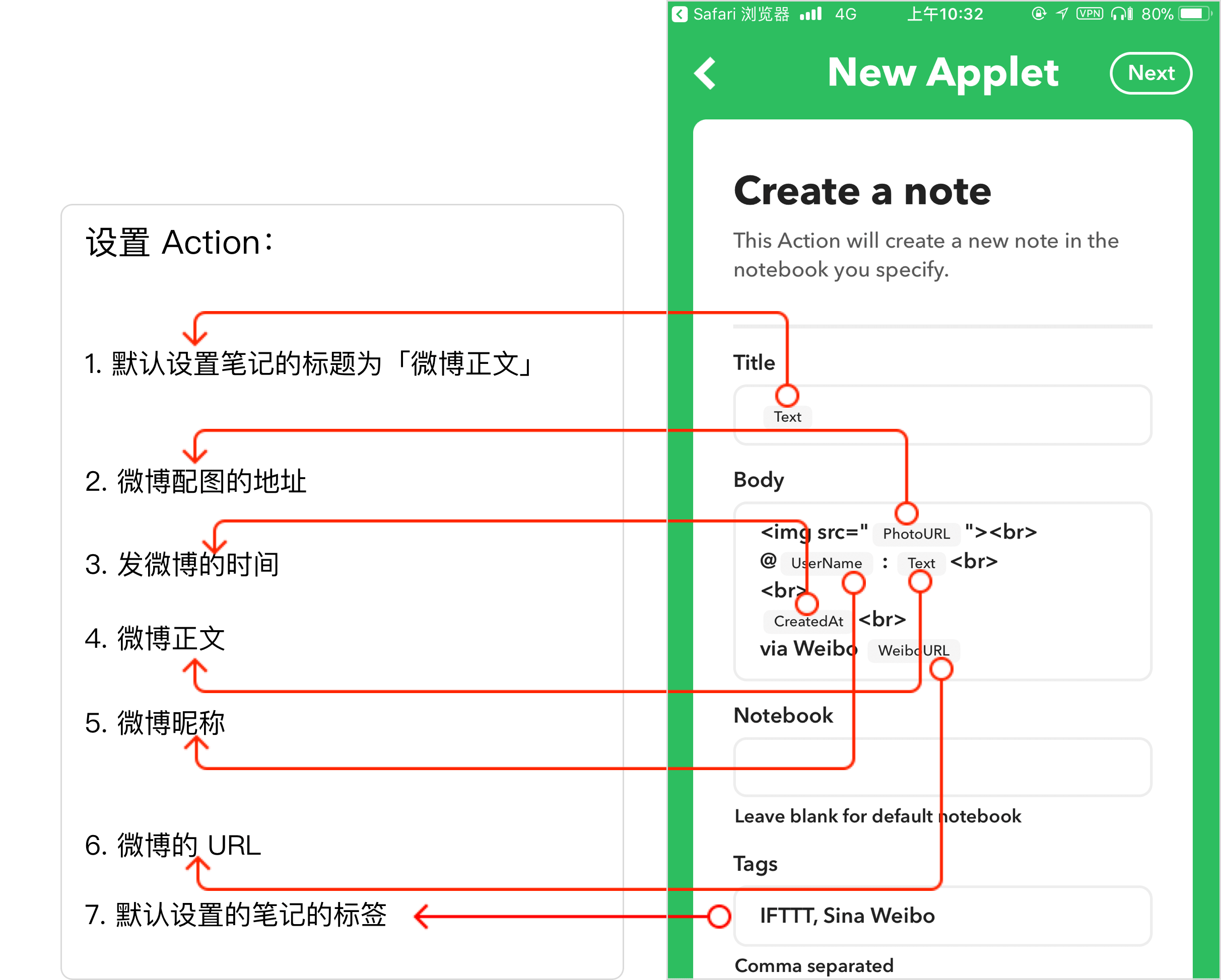 想一下,在这个自动化任务中,我们希望把「新浪微博发的内容转存到印象笔记中」,这里不是针对某一条特殊的微博,而是针对所有在新浪微博发布的微博,所以我们就要设置一套规则,告诉 IFTTT 把我发布的微博的具体哪些内容(比如图片和文字)保存到印象笔记。这套规则肯定是通用的,不能代表某一篇具体的微博,所以这里使用了编程思想中的「变量」概念。
