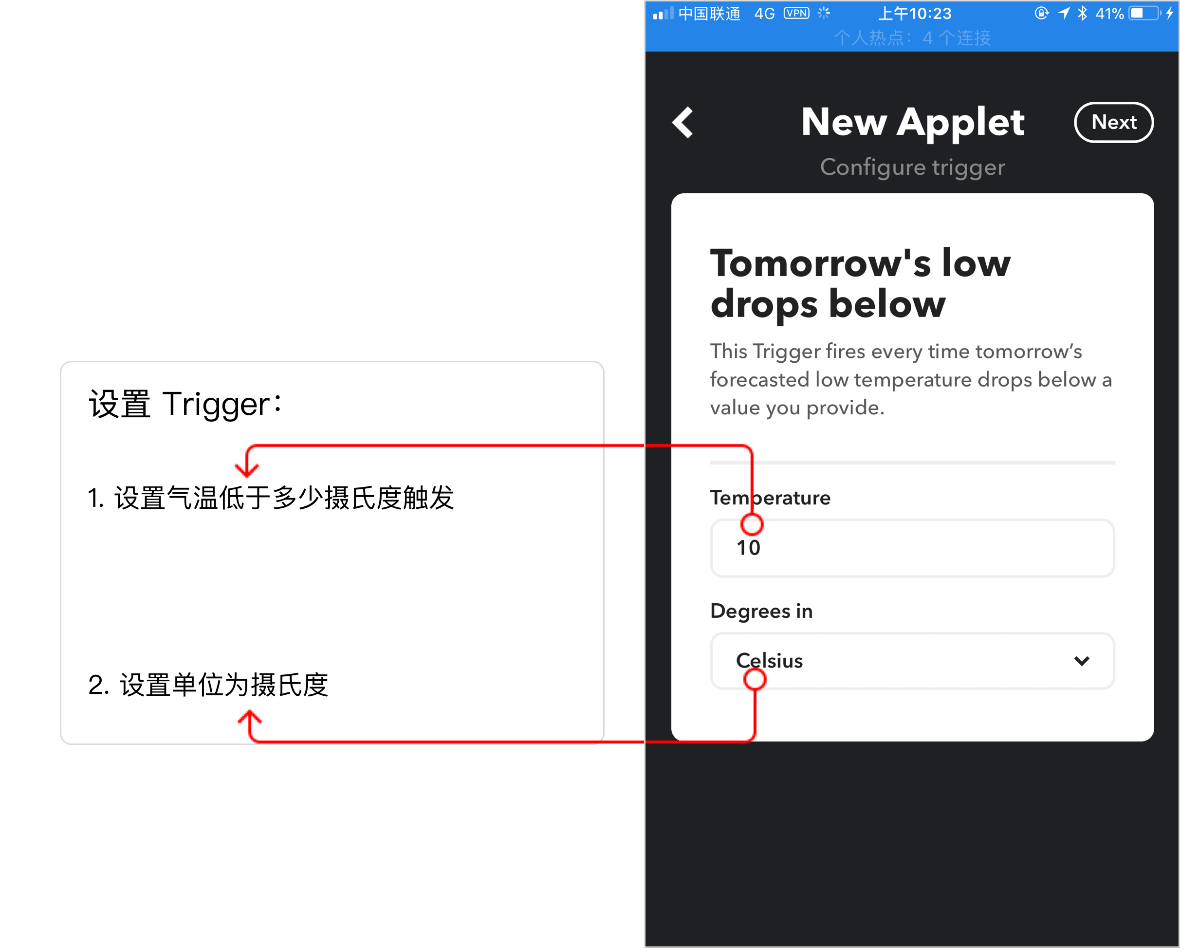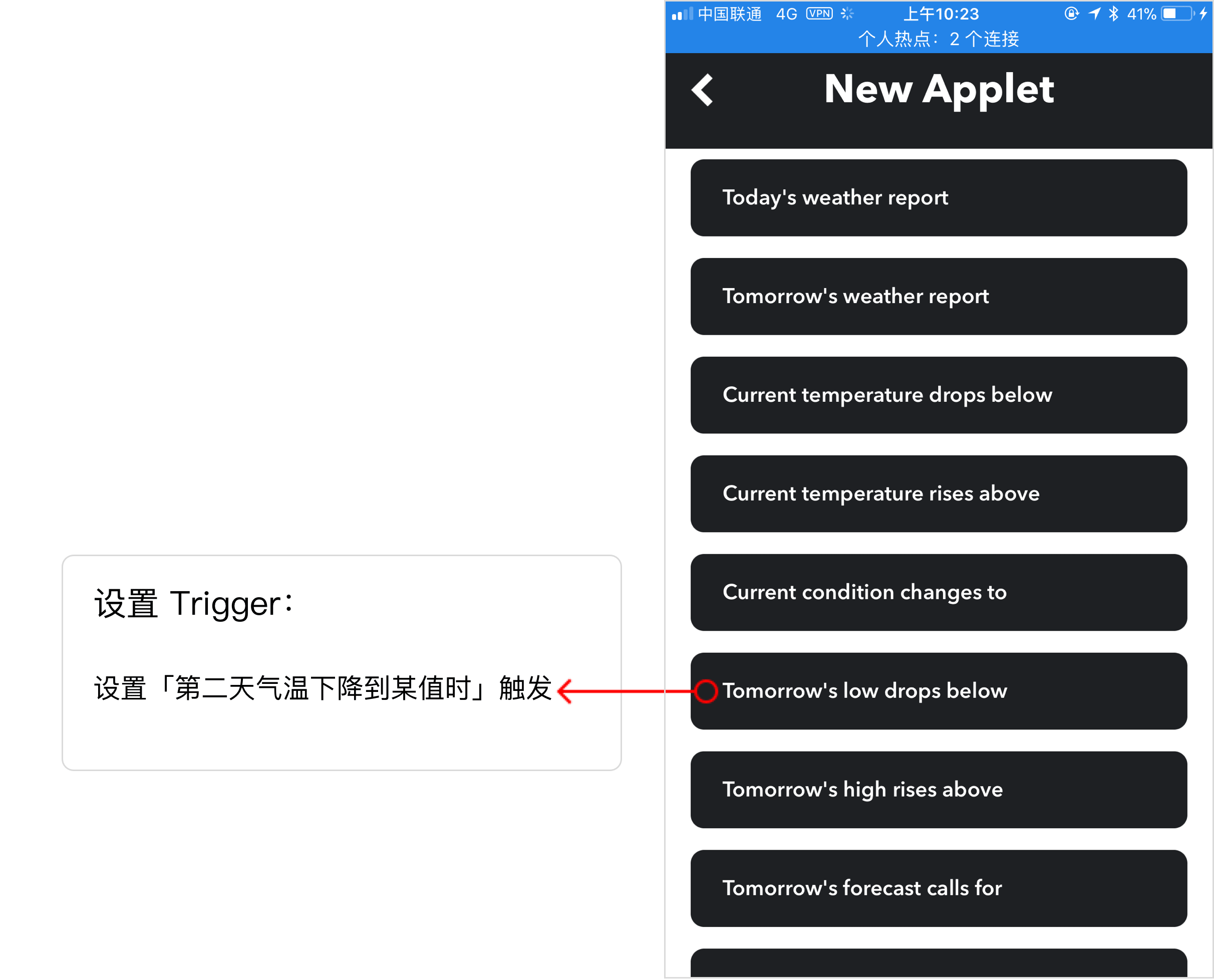 设置 Trigger 的条件,根据需求我们设置「如果第二天气温降到 10 摄氏度以下」,很显然选择「Tomorrow’s low drops below」,并且设置条件为「10 摄氏度以下」。