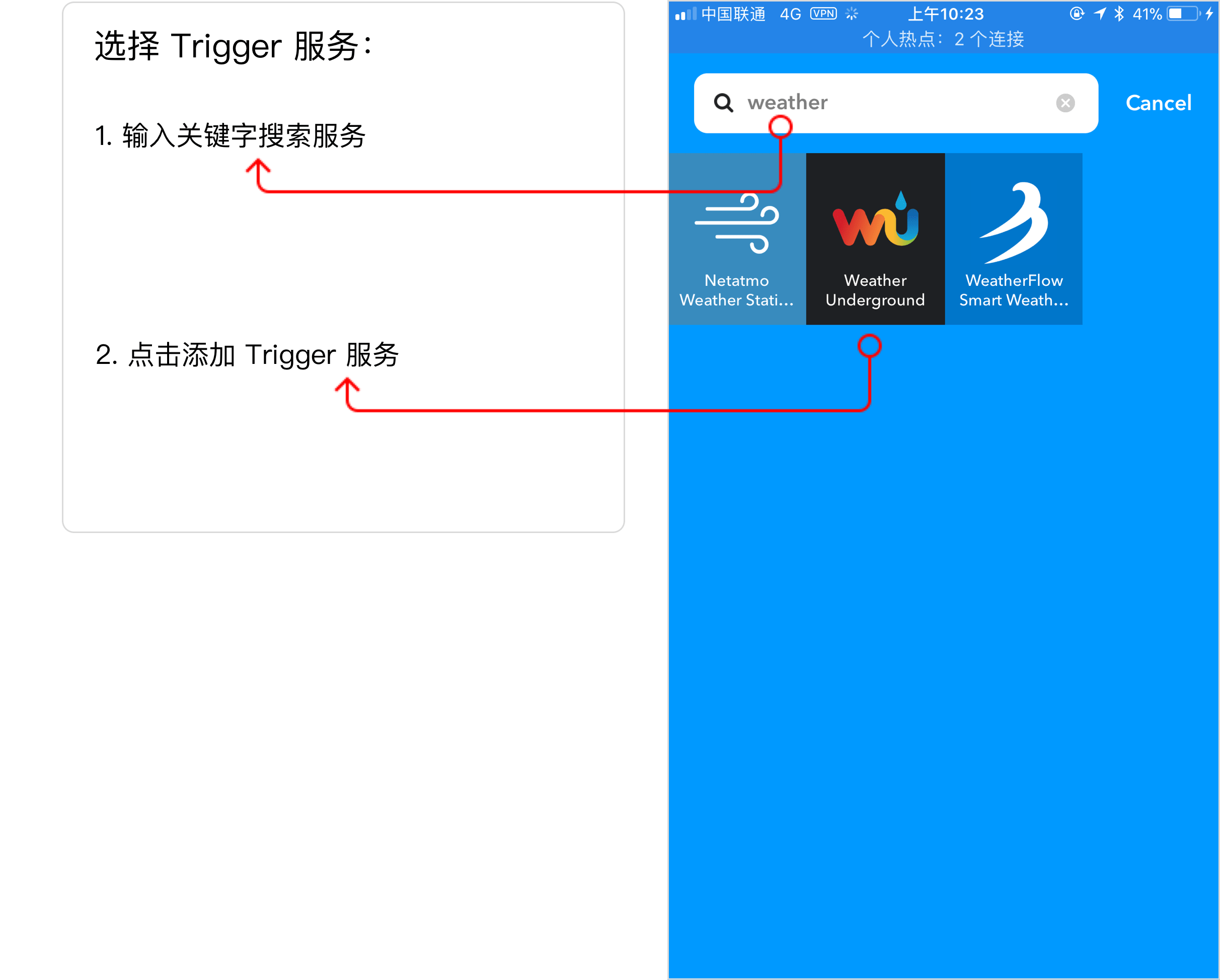 选择 Trigger 对应的服务,这里我们选择官方提供的 Weather Underground 服务,我们通过搜索可以找到。