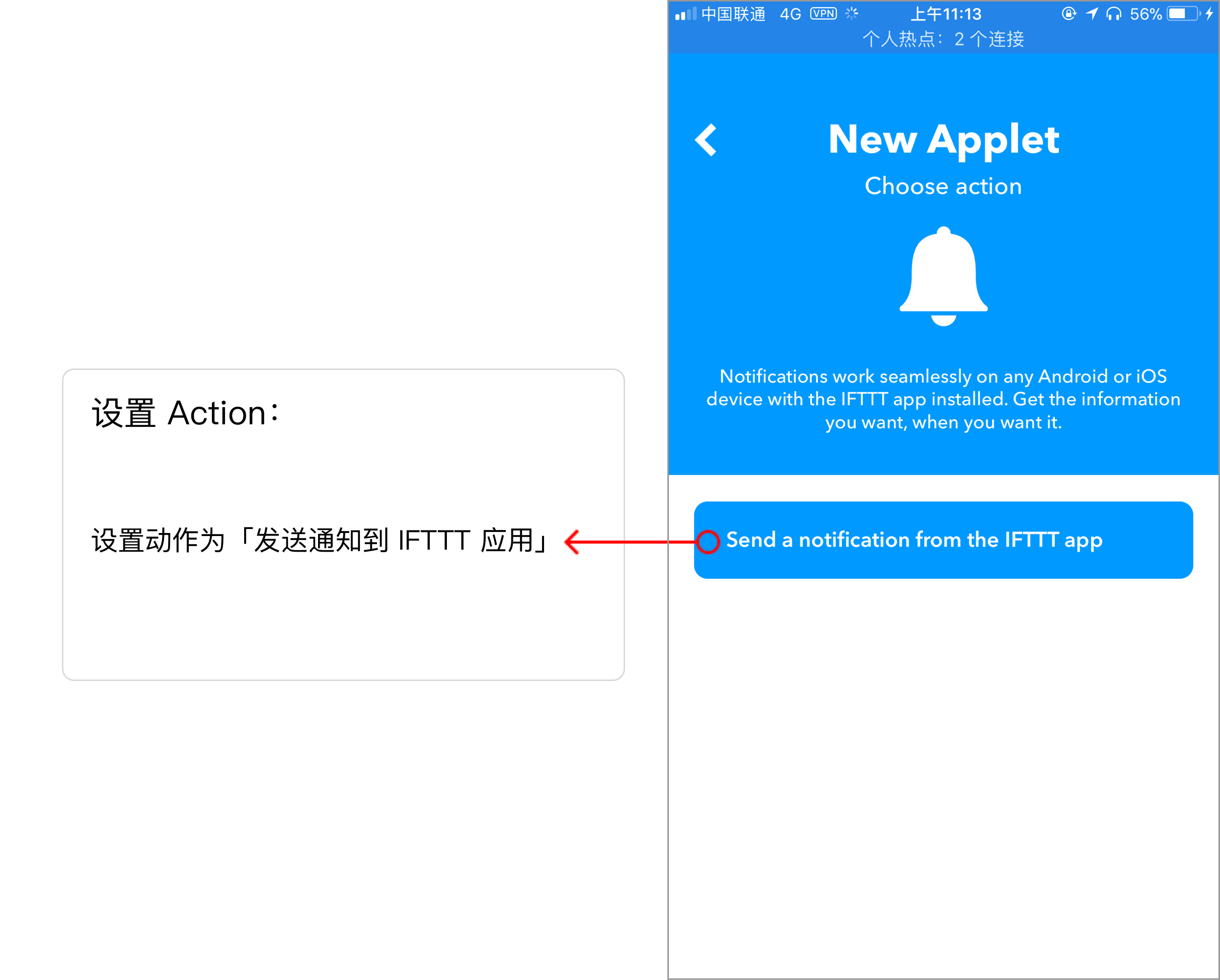 选择 Action 对应的服务,这里我们选择官方提供的 Notifications,并且设置具体 Action 为推送消息到 IFTTT 应用。