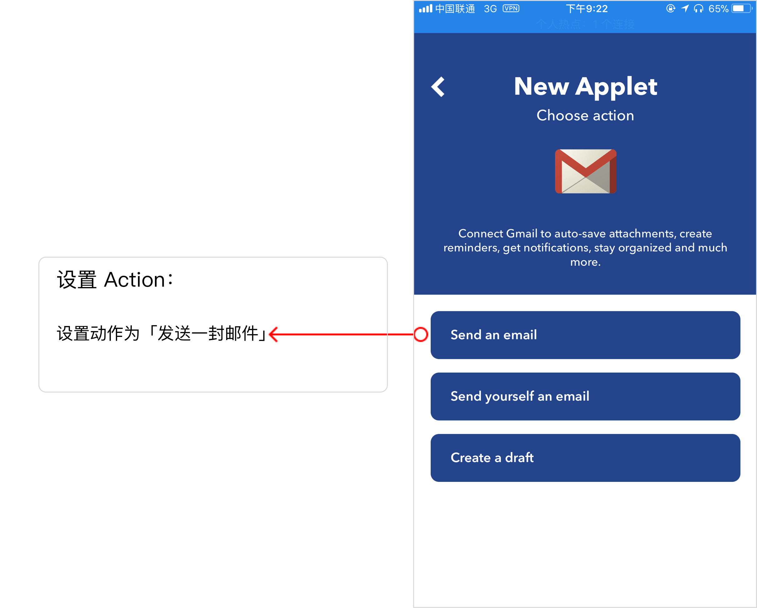 选择 Action 对应的服务,这里我们选择 Gmail,并且设置具体 Action 为「发送附件到指定邮箱」,很明显我们应该选择 Send an email。