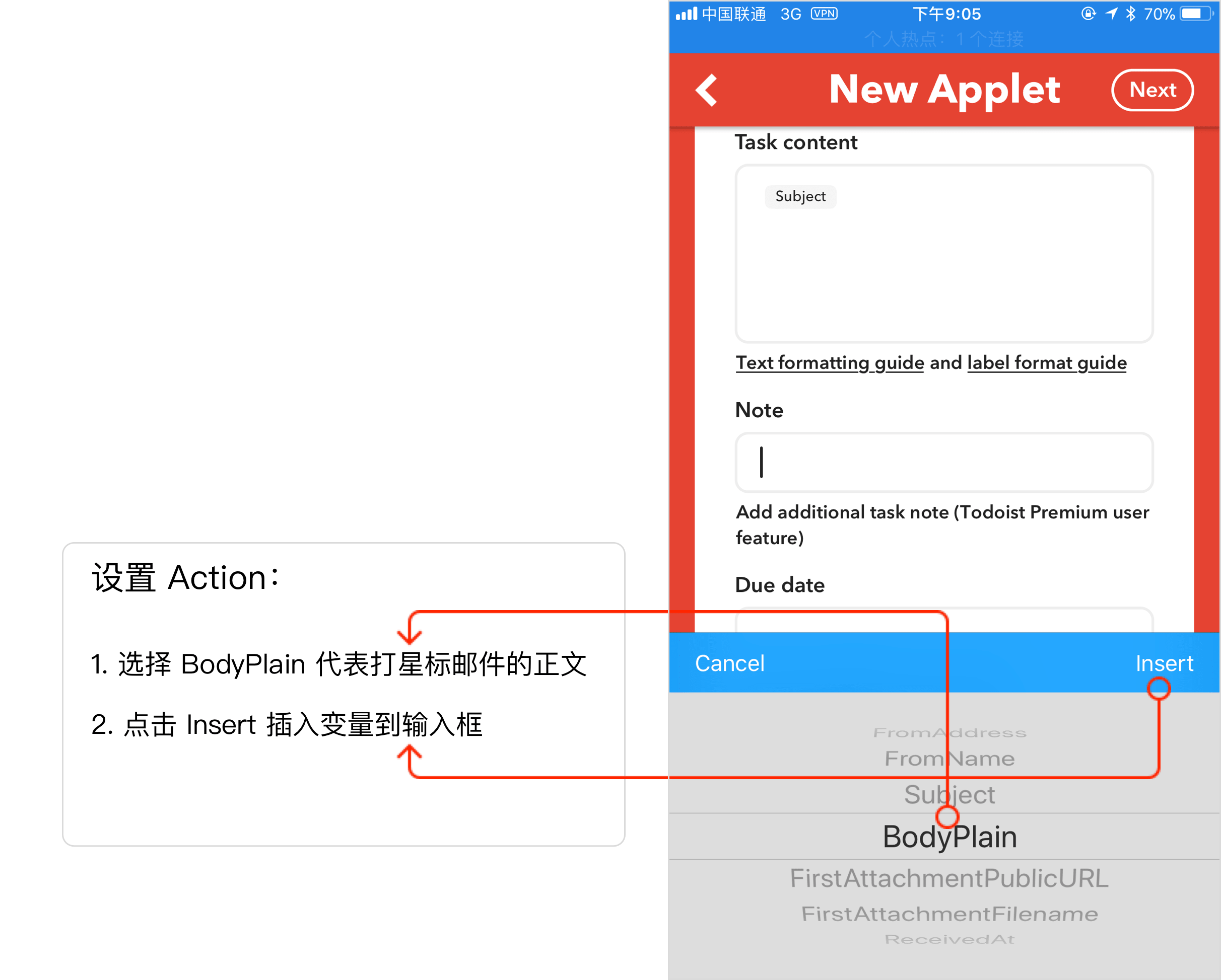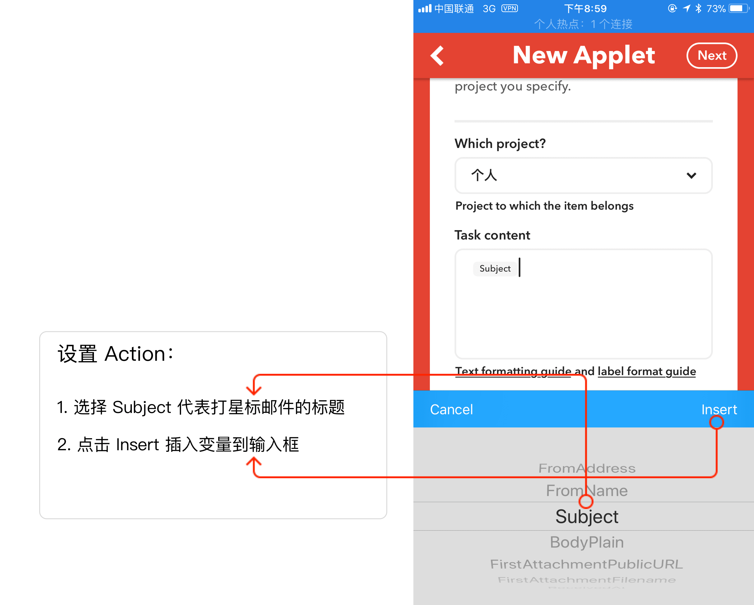 我们看一下「如何设置 Todoist 的任务标题为打星标的邮件的标题?」其实很简单,我们只需要找到代表邮件标题的「变量」,插入到任务标题输入框中即可,如图: