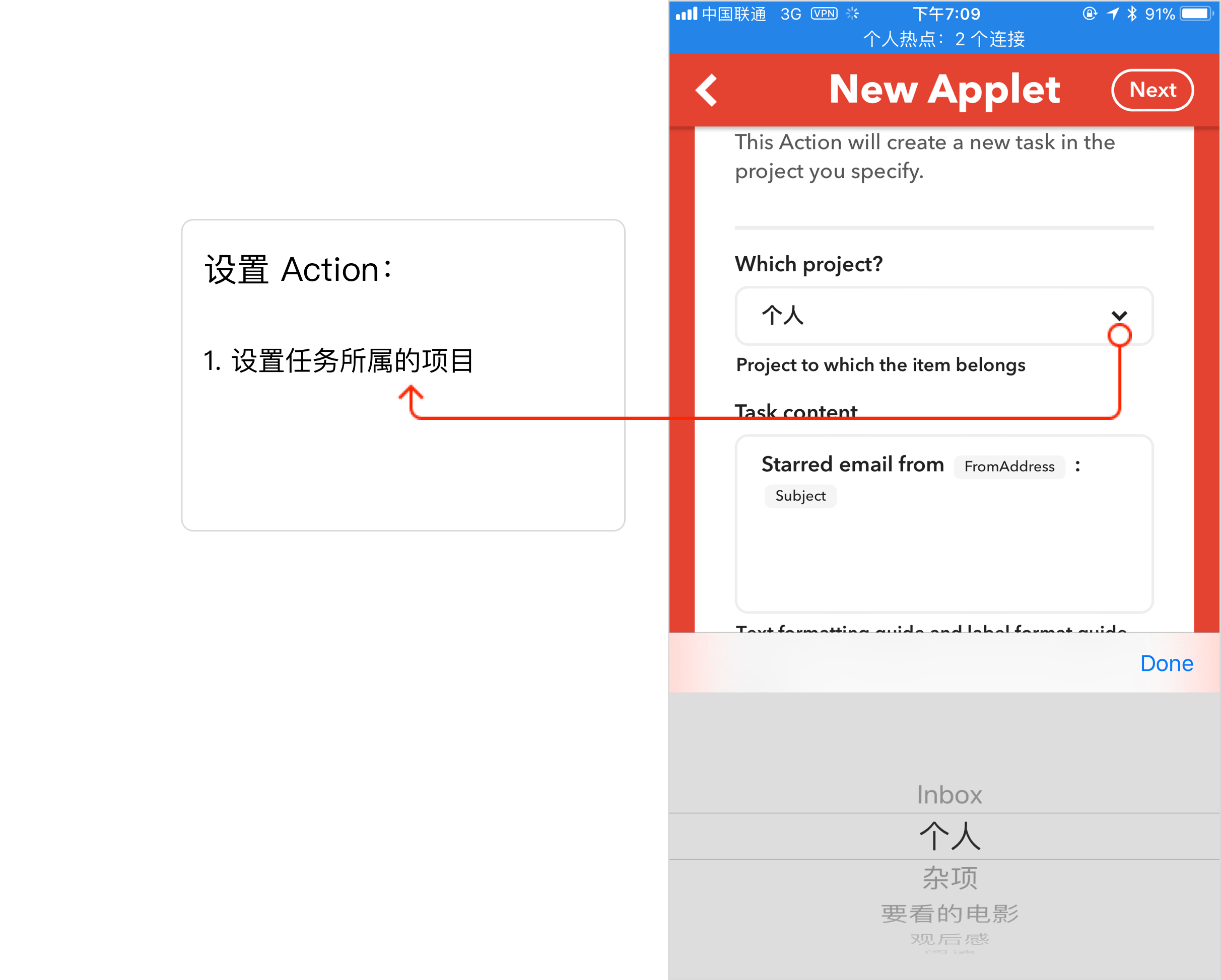 IFTTT 非常智能地读取到了 Todoist 中我们设置好的项目名称,我们只需要点选即可,使用起来非常简单。