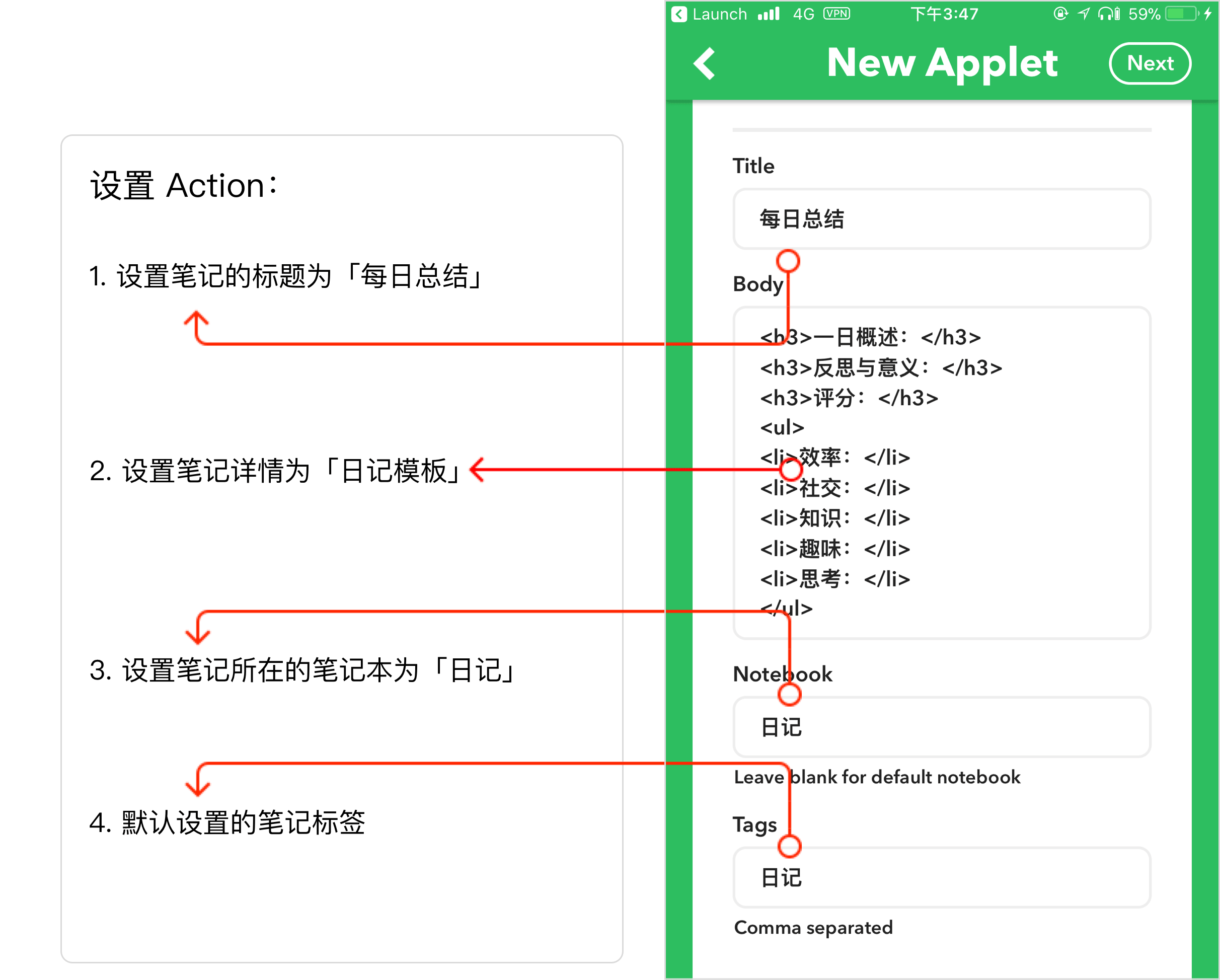 设置 Action 模版,将日记模版添加进去,并设置保存到名为「日记」的笔记本,设置笔记的标签为「日记」。