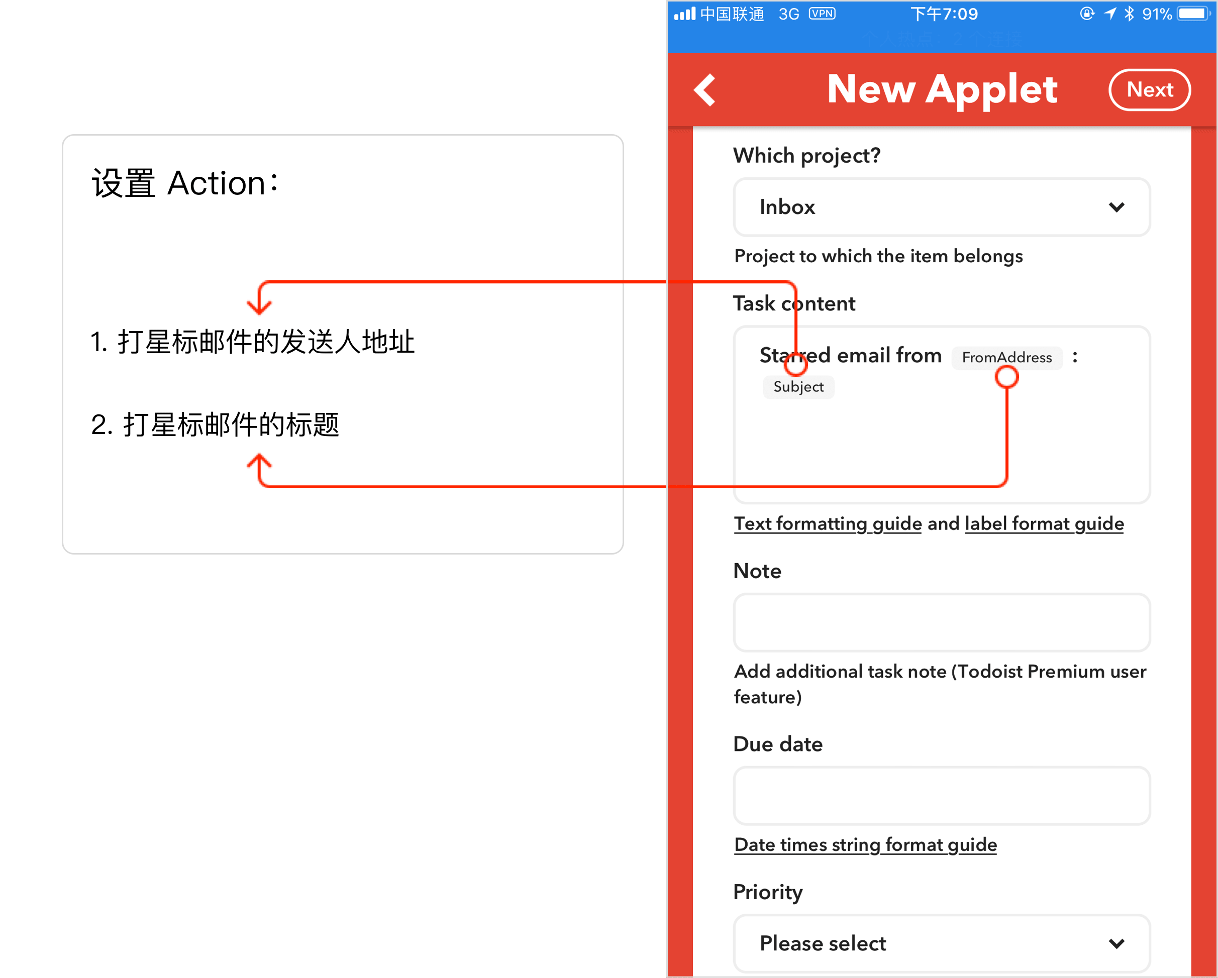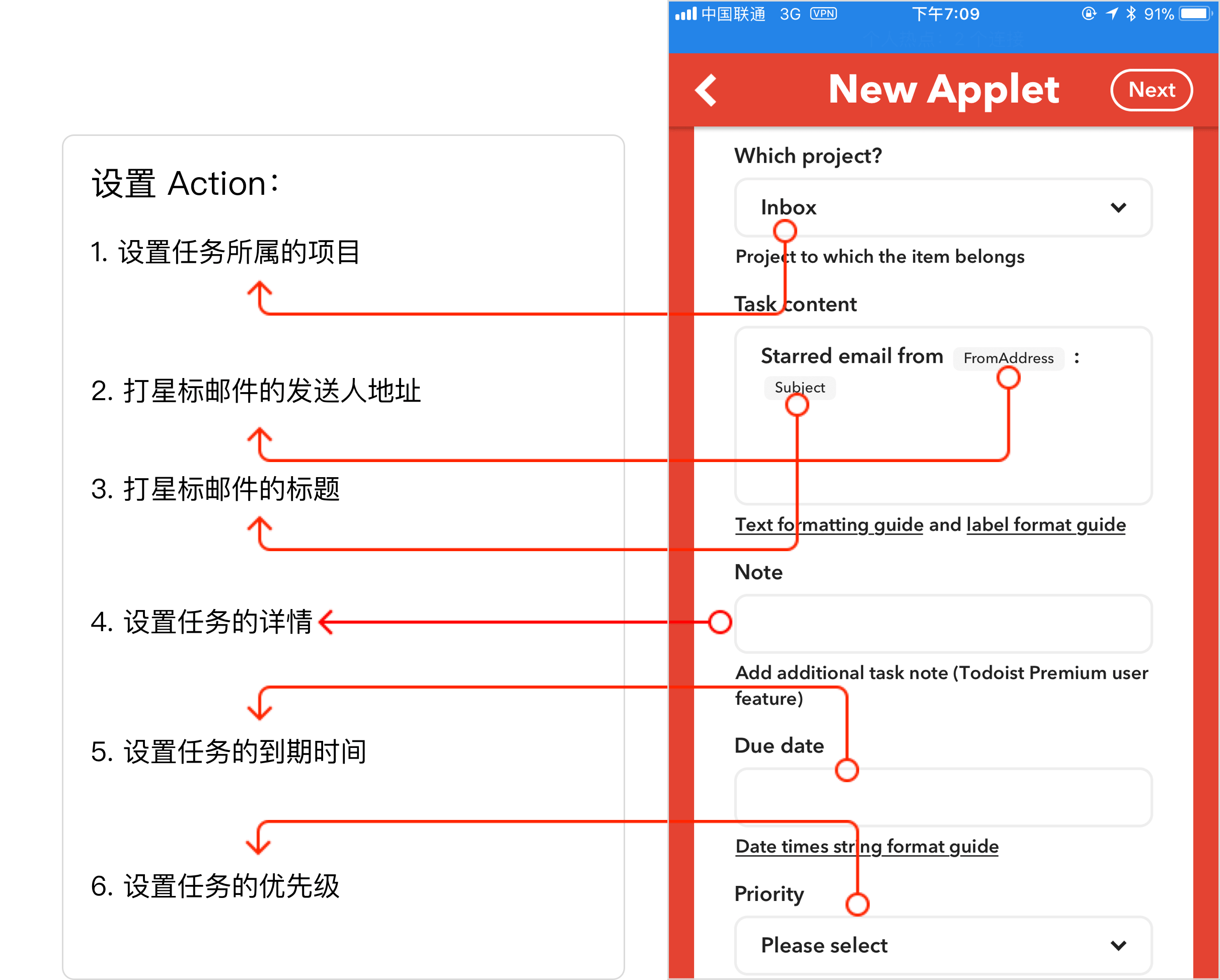 设置 Action 对应的模版,即告诉 Todoist 创建什么样的任务。这里我们的需求是任务的标题和 Gmail 中打星标的那封邮件标题一样,任务详情就是那封邮件的详情。我们看一下模版都有哪些内容需要填写: