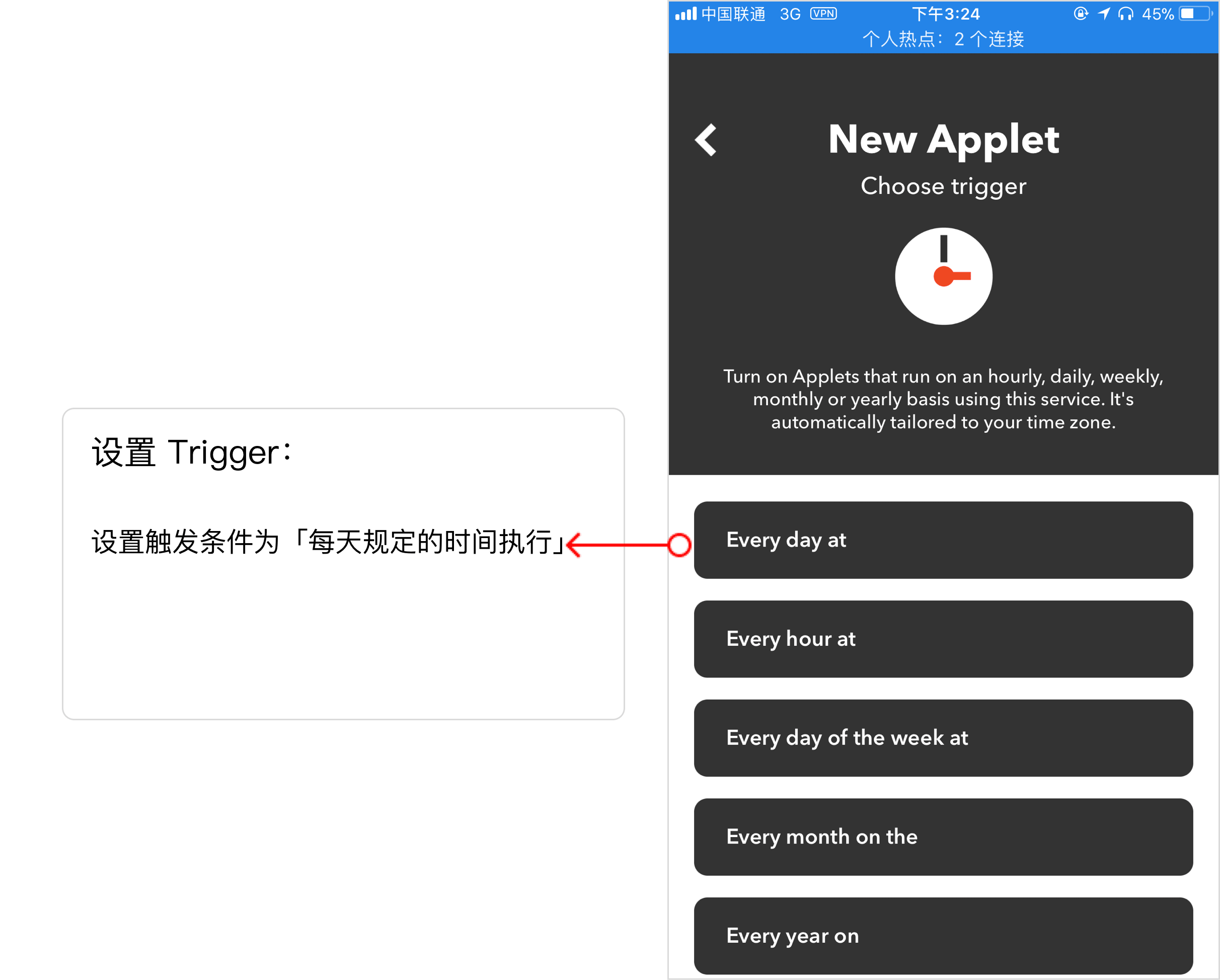 设置 Trigger 条件,根据需求我们需要每天定时提醒,很显然选择「Every day at」,并且设置条件为「每天 21:00」。
