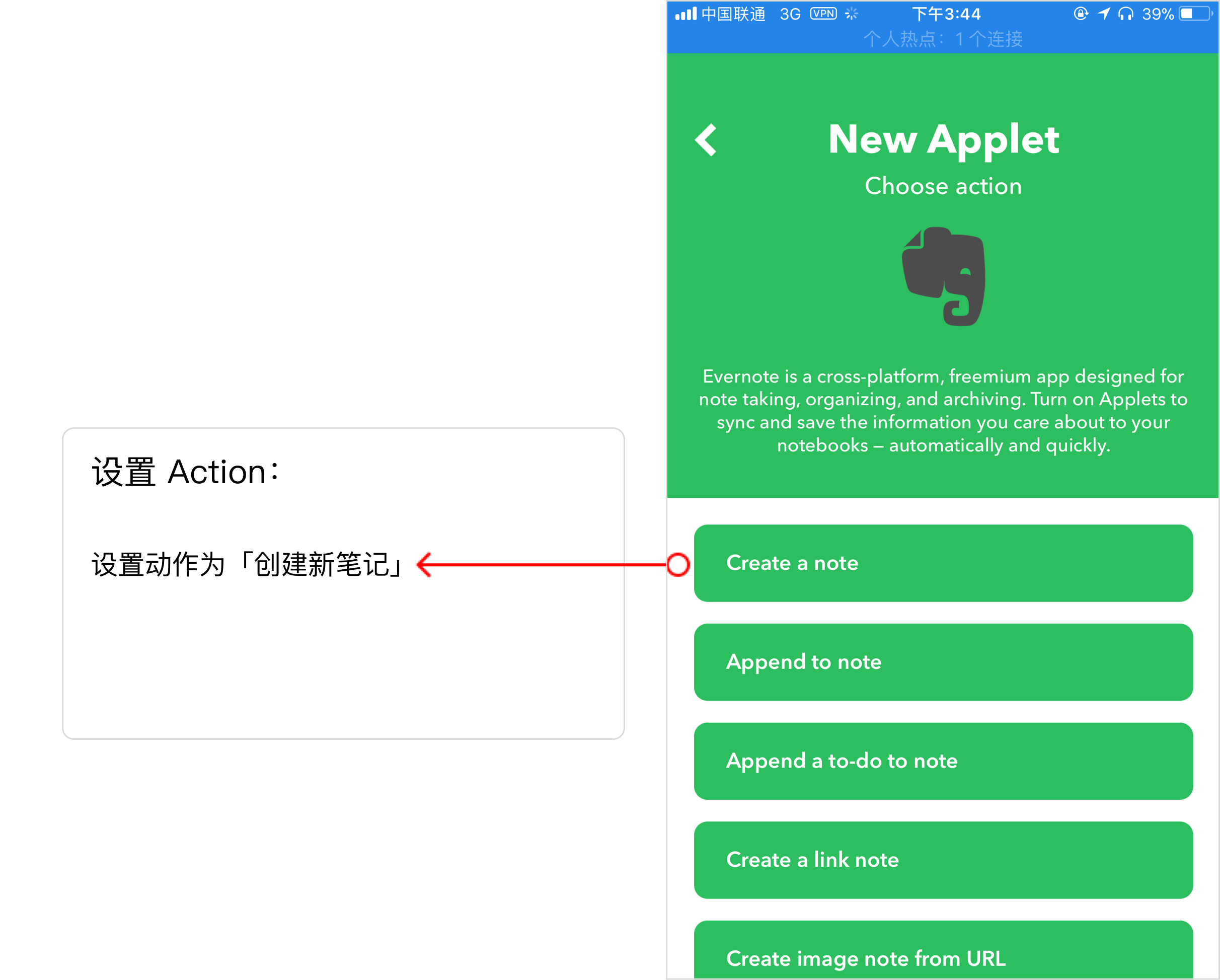 选择 Action 对应的服务,这里我们选择 Evernote,并且设置 Action 为创建一篇新文章。