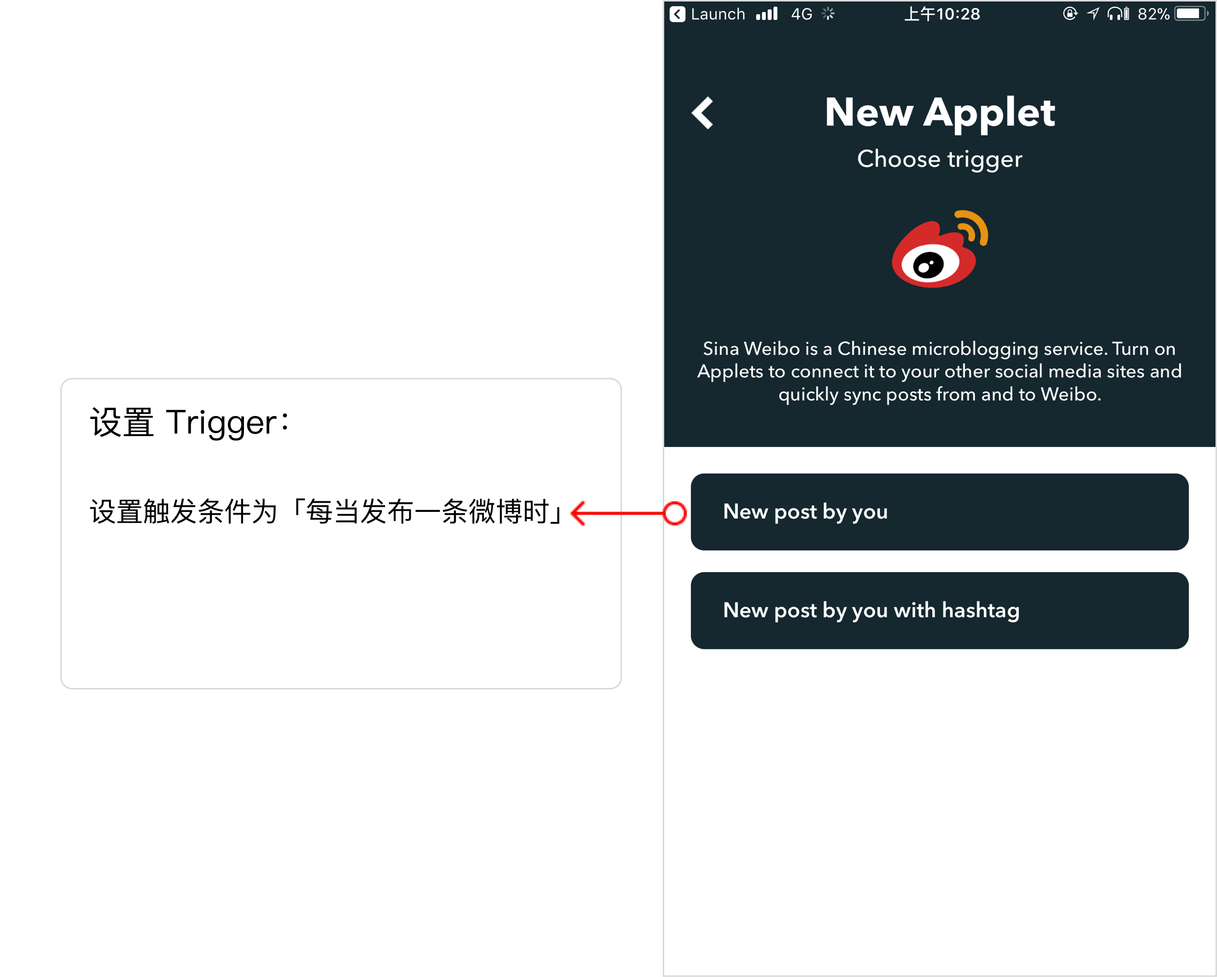 选择 Trigger 对应的服务,我们选择 Sina Weibo 服务,可以通过搜索找到它,并设置触发条件为「每当发布一条微博时」。
