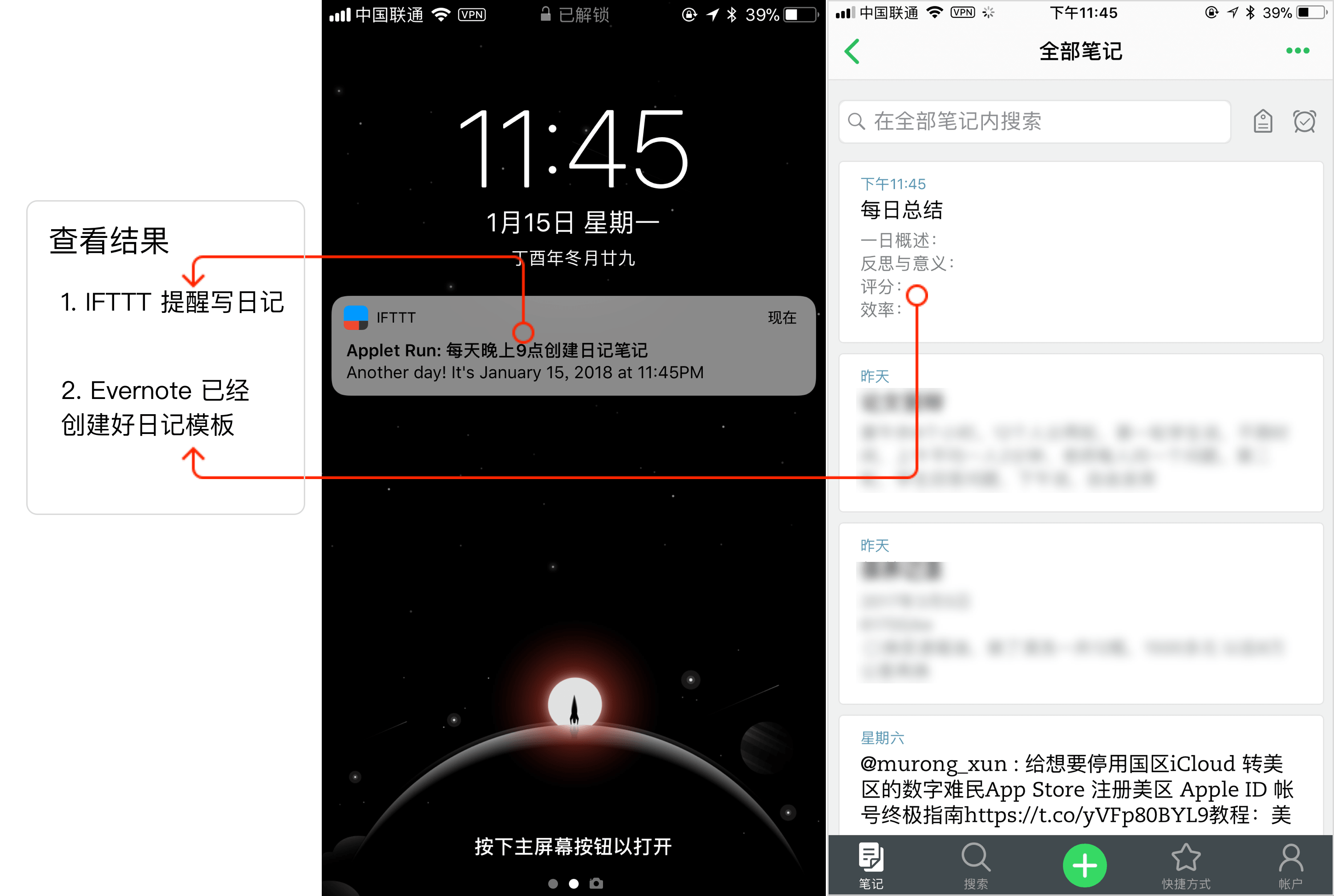 我的办法是,在你习惯的任务管理软件里比如「提醒事项」,设置每天 21:30 提醒写日记,当时间到了以后由于有了「每天晚上 9 点生成日记模版」这个自动化任务,我们只需要打开 Evernote 就能够看到创建好的模版,直接开始写日记。
