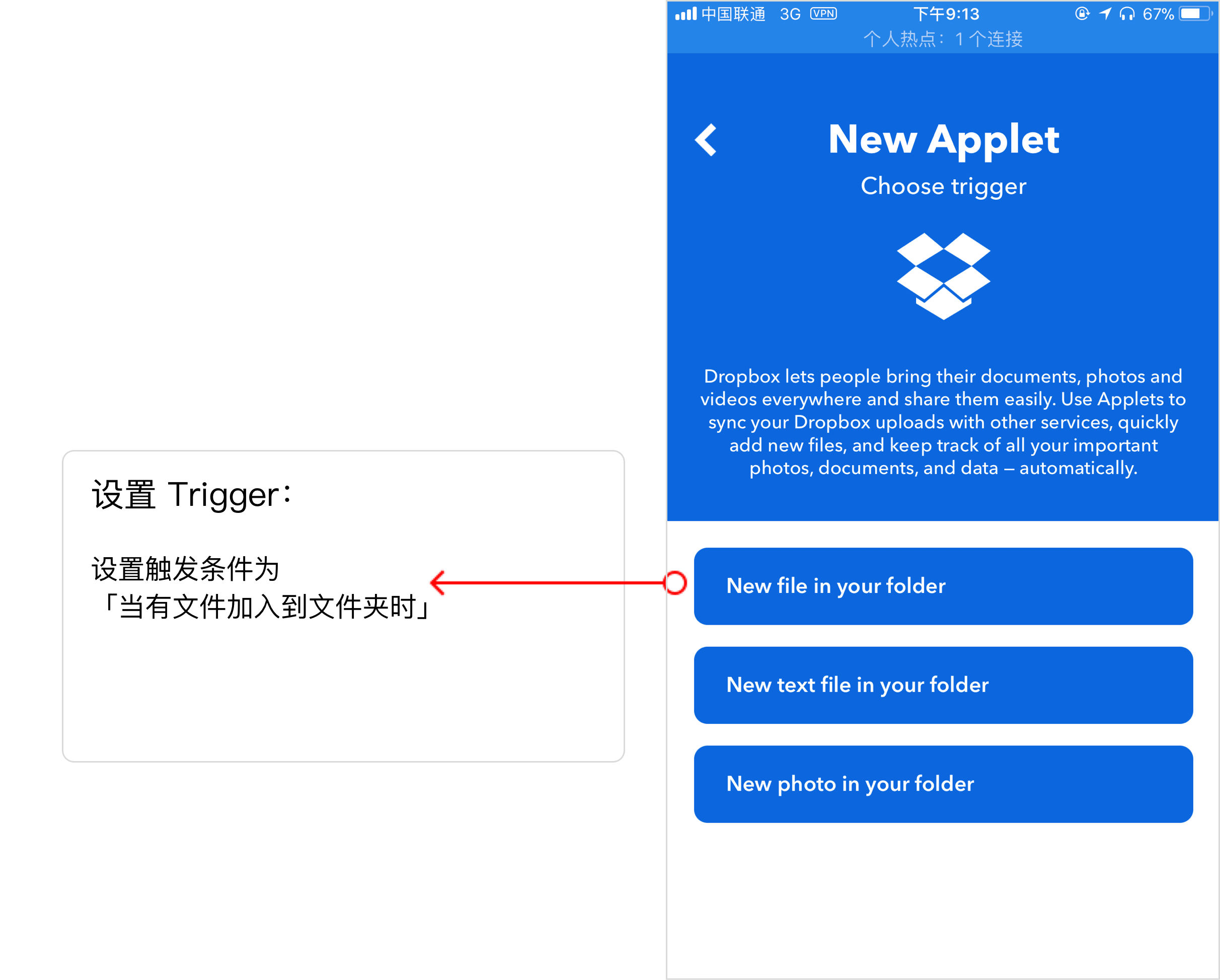 选择 Trigger 的服务,这里我们选择 Dropbox。设置 Trigger 条件为「当文件夹中新增了文件时」。