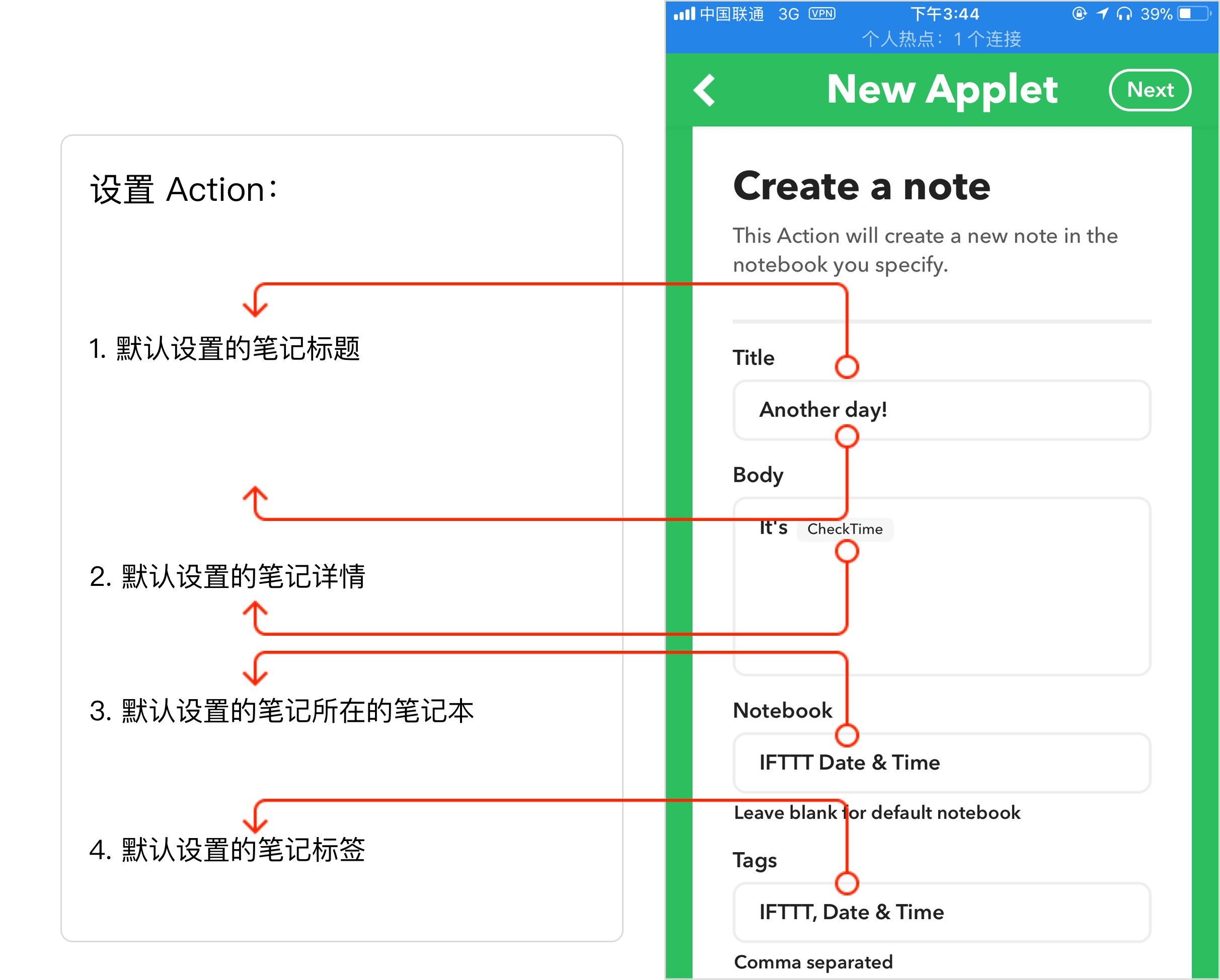 选择 Action 对应的服务,这里选择 Evernote,并且设置 Action 为创建一篇新文章,最后设置文章内容为新浪微博发布内容。