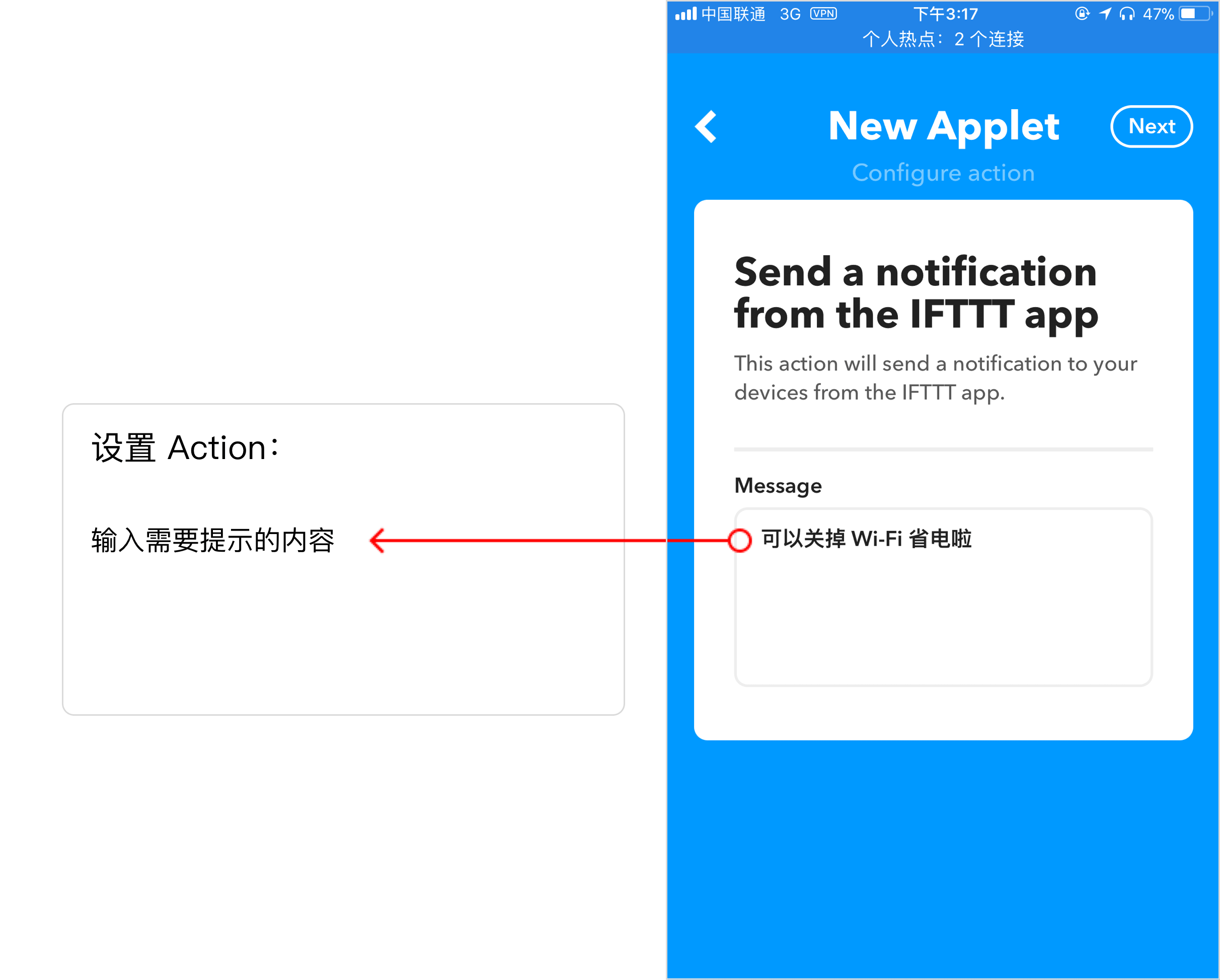 选择 Action 对应的服务,这里我们选择官方提供的 Notifications,并且设置具体 Action 为推送消息到官方 app,设置推送内容为「提醒关闭 Wi-Fi」。
