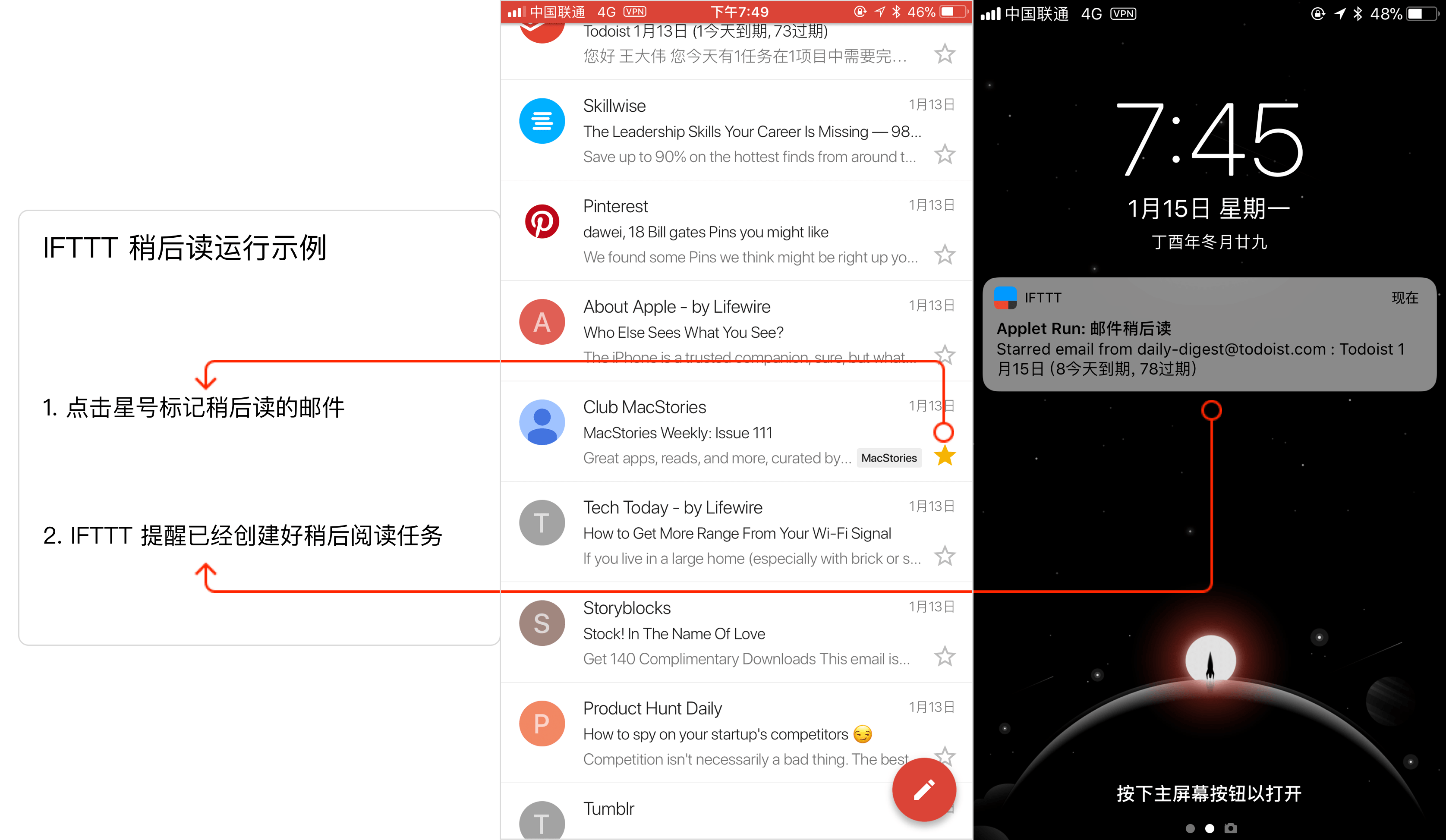 开始前我想先回答一下问题,可能有人会有疑问,许多优秀的邮箱客户端都提供了「稍后阅读」的功能,比如 Airmail,Spark,为什么我们要使用 IFTTT 的服务呢? 工具提供的稍后读服务,通常都会预制一些提醒选项,比如明天 8 点提醒,今天晚上 8 点提醒等,但是预制的时间无法自定义,如果你像我一样喜欢睡前一小时整理「待办事项」的话,就无法愉快的使用了。
