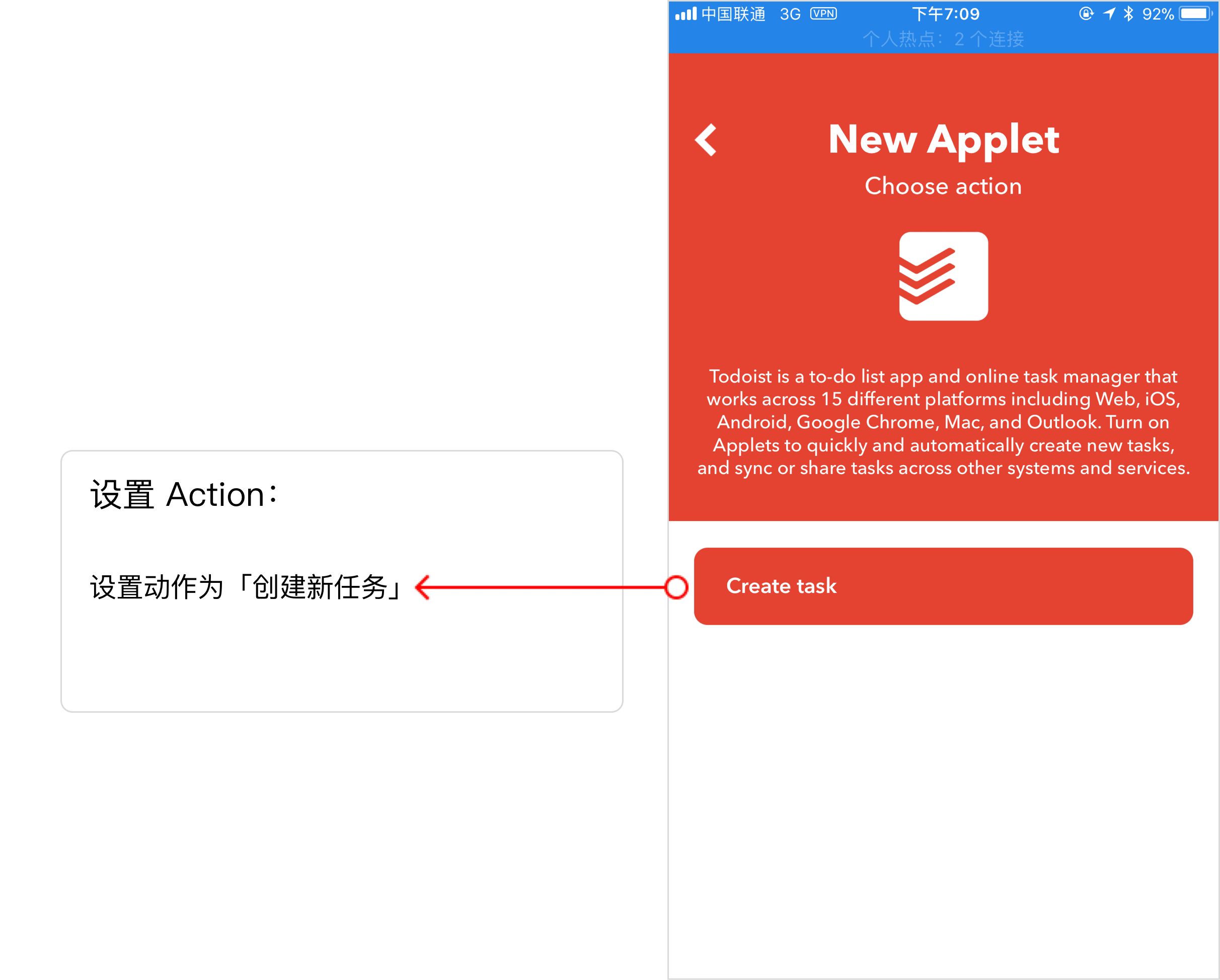 选择 Action 对应的服务,这里我们选择 Todoist,并且设置具体 Action 为「创建一条任务到 Todoist」,很明显我们应该选择 Create Task。