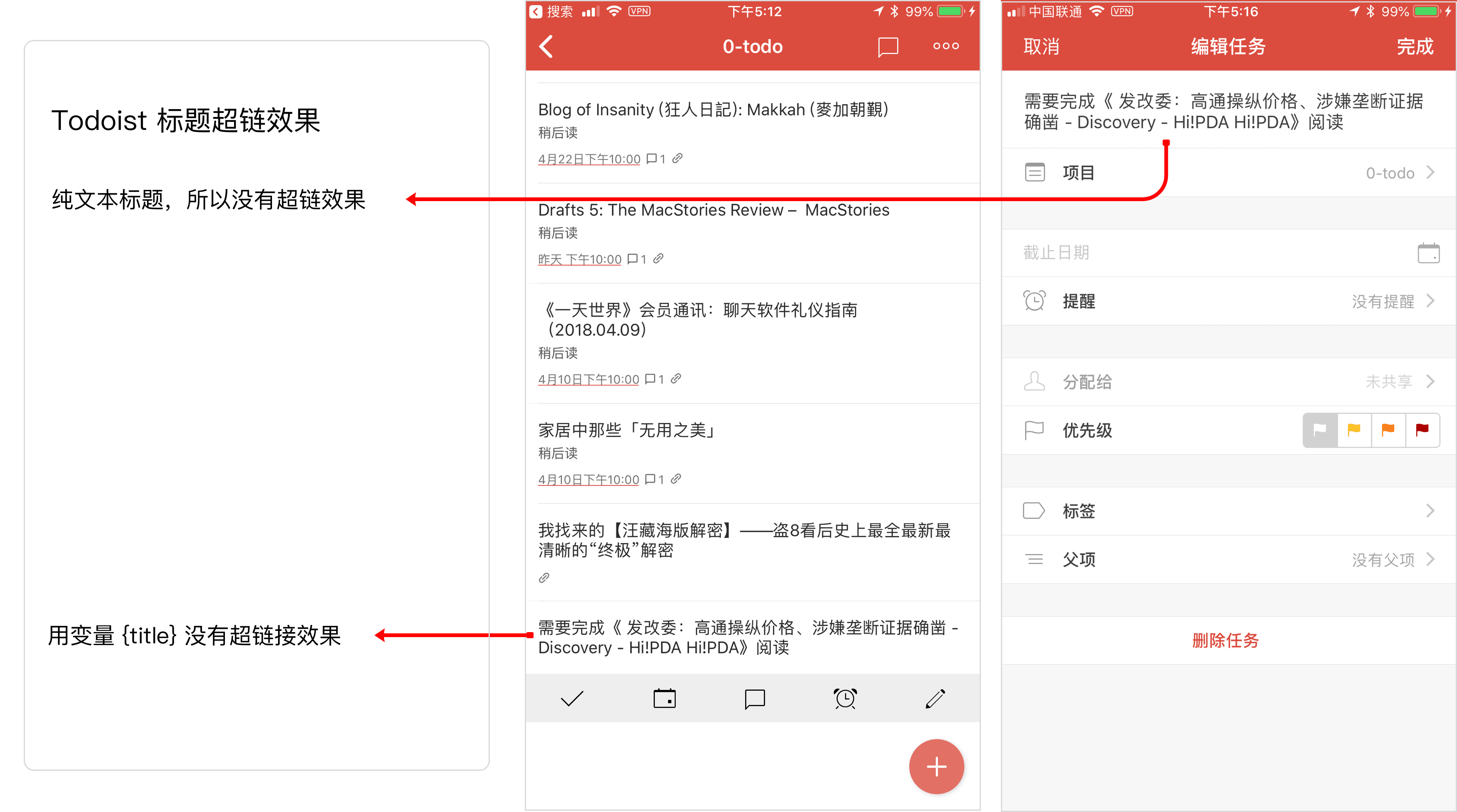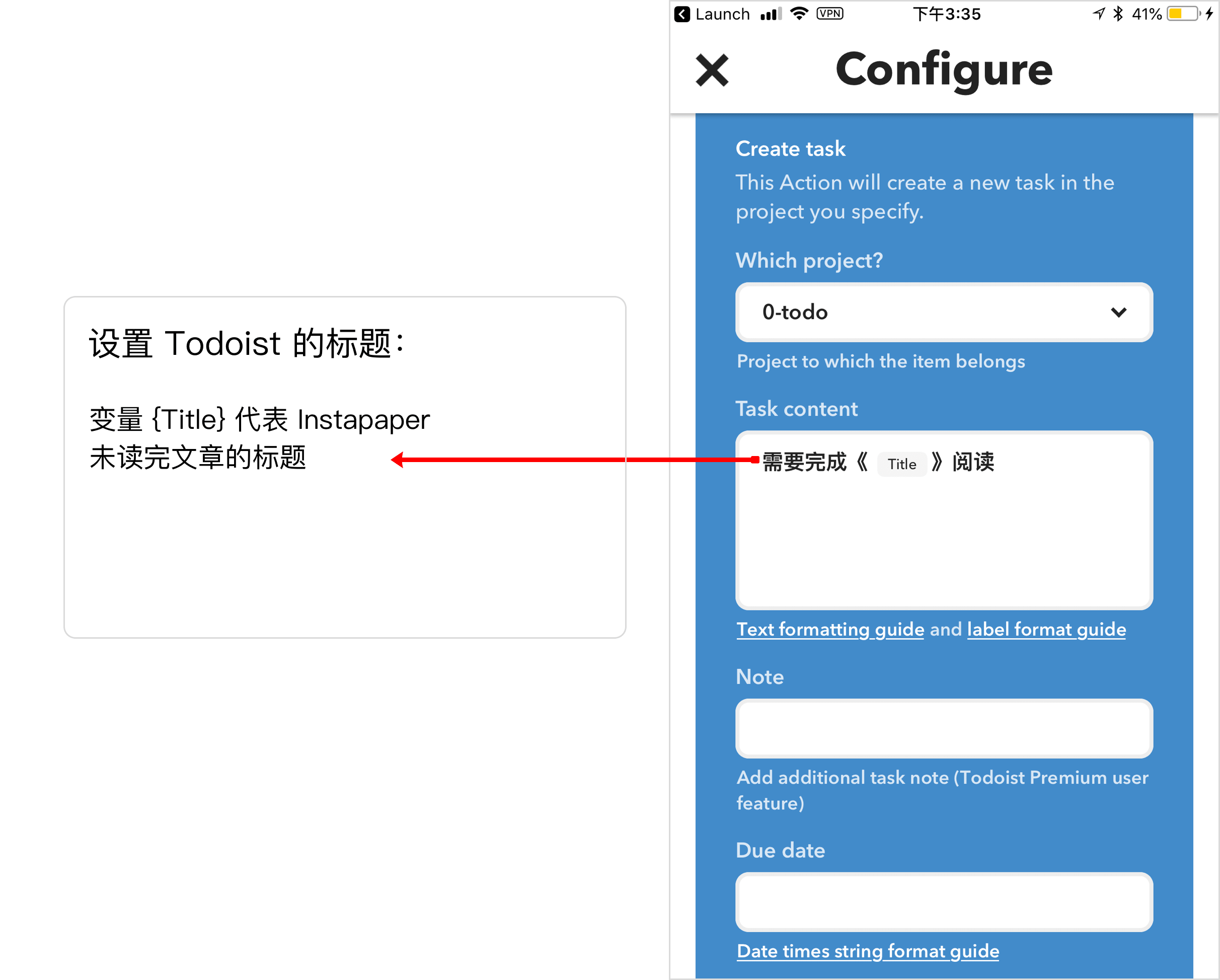 这个问题出现在 IFTTT 创建 Todoist 任务时。以 @风影默「把 Instapaper 未读文章发到 Todoist」为例,为了实现此功能,我们很自然的想到让 Todoist 的标题为 Instapaper 的文章标题,这样看起来会比较直观,如图: